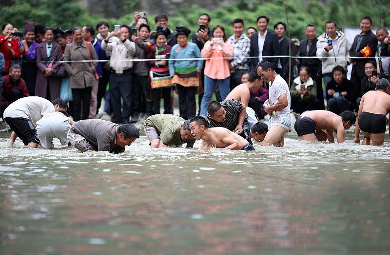 4月23日,贵州黔东南岔河村举行乡村“三月三”民族文化节 。图为岔河村的村民在文化节上参与徒手抓鱼活动。(CFP)