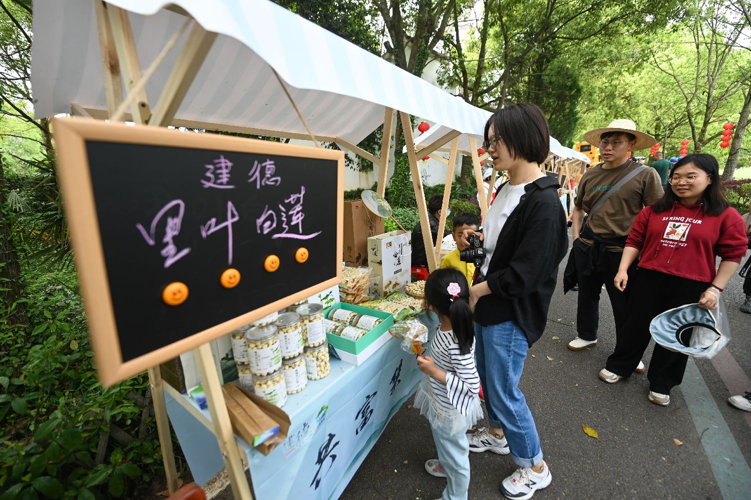 4月21日,2023建德市新叶“三月三”农耕文化节在建德市大慈岩镇新叶古村开幕。现场举行了“龙游硬头狮子”“严州虾灯”“李村抬阁”及昆曲等10余项非遗文化展演。图为乡村文化节现场的共富集市上展卖的农产品。(新华社)