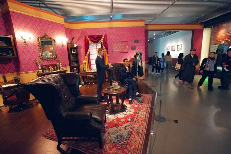 本次展览得到英国柯南·道尔产权会授权。展览分为“横空出世 罪恶克星”、“隐身爵士 造就传奇”、“后世影响 验证真理”、和“Case Lab 元世界”四个单元。图为观众走过展厅里复原搭建的福尔摩斯故事场景。(北京新京报网)