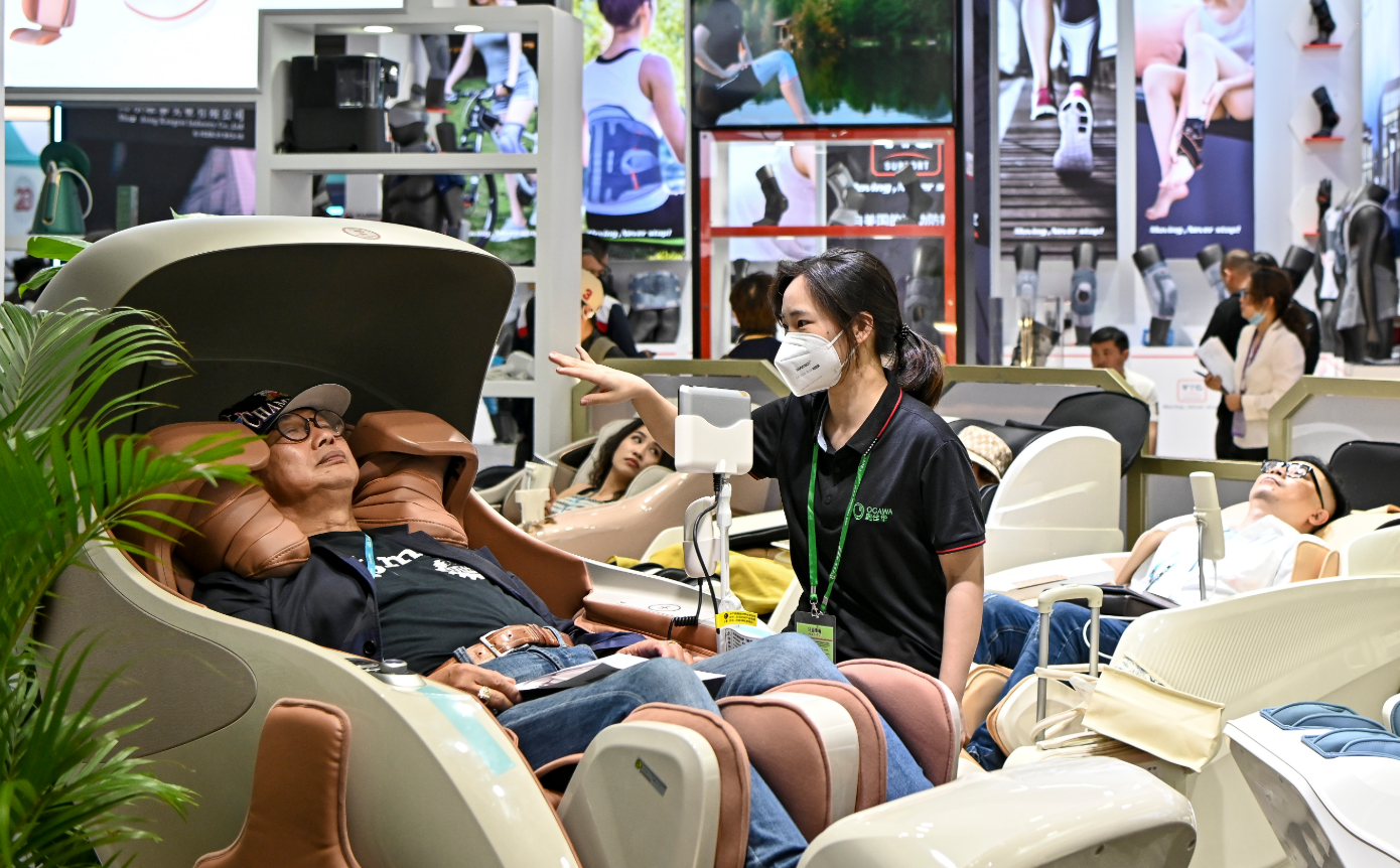 5月1日,广东省广州市,采购商在广交会上体验一款按摩椅。(图/中新社)