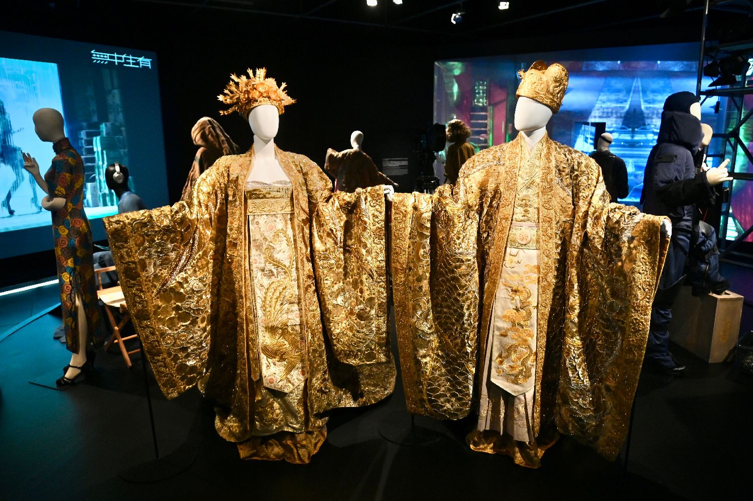 5月2日,香港特区政府康乐及文化事务署与香港电影美术学会联合主办的“无中生有——香港电影美术及服装造型展”于香港文化博物馆举行。图为周润发及巩俐于电影《满城尽带黄金甲》中的帝后大朝服。(中新社)