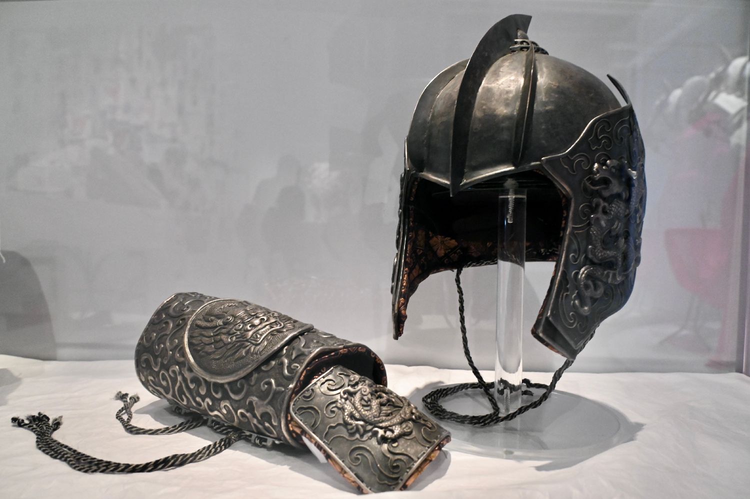 展出包括周杰伦、周润发、巩俐于电影《满城尽带黄金甲》中的服装造型、周星驰系列电影服装造型,以及其他香港经典电影的美术与服装造型及道具,呈现香港电影发展。图为周杰伦于电影《满城尽带黄金甲》中佩戴的头盔及臂甲。(中新社)