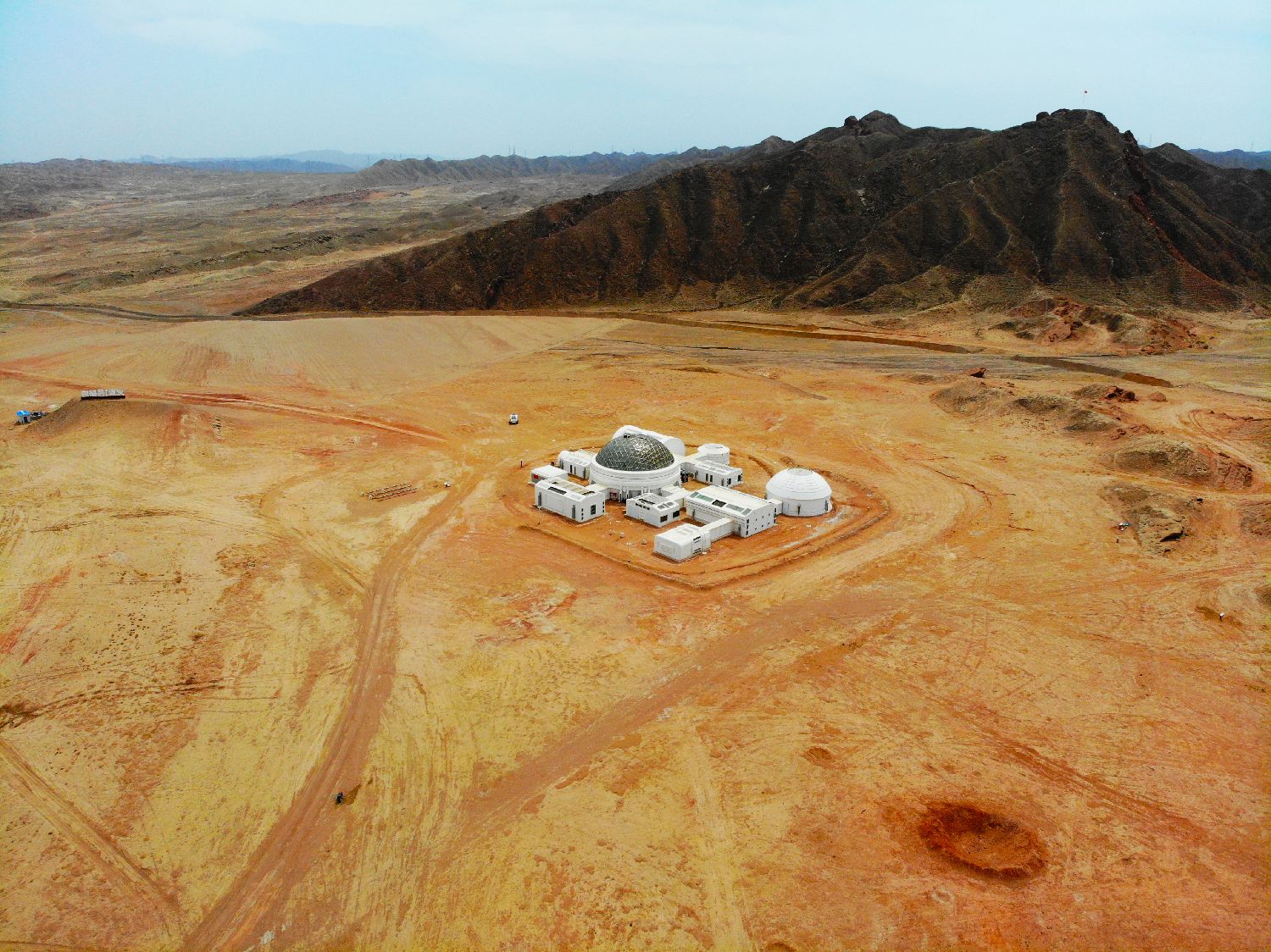 基地通过火星生存场景模拟、实体建筑仿制、科幻造景等手段,打造出中国首个火星主题沉浸式实景体验基地。图为5月15日,航拍火星1号基地。(中新社)