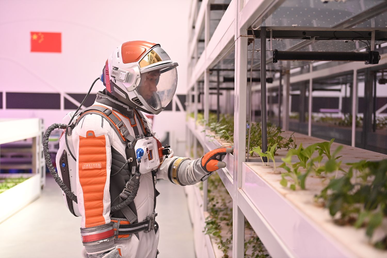 5月15日,在“火星1号基地”的火星模拟生存体验中心内,体验者进行舱体气体泄漏模拟训练时检查舱内植物。(中新社)