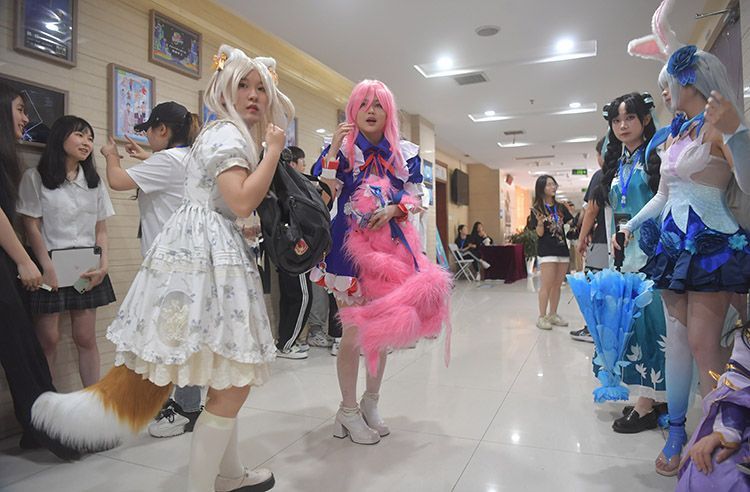 参加Cosplay(角色扮演)表演的大学生装扮成游戏中虚拟世界人物为活动造势。(北京新京报网)
