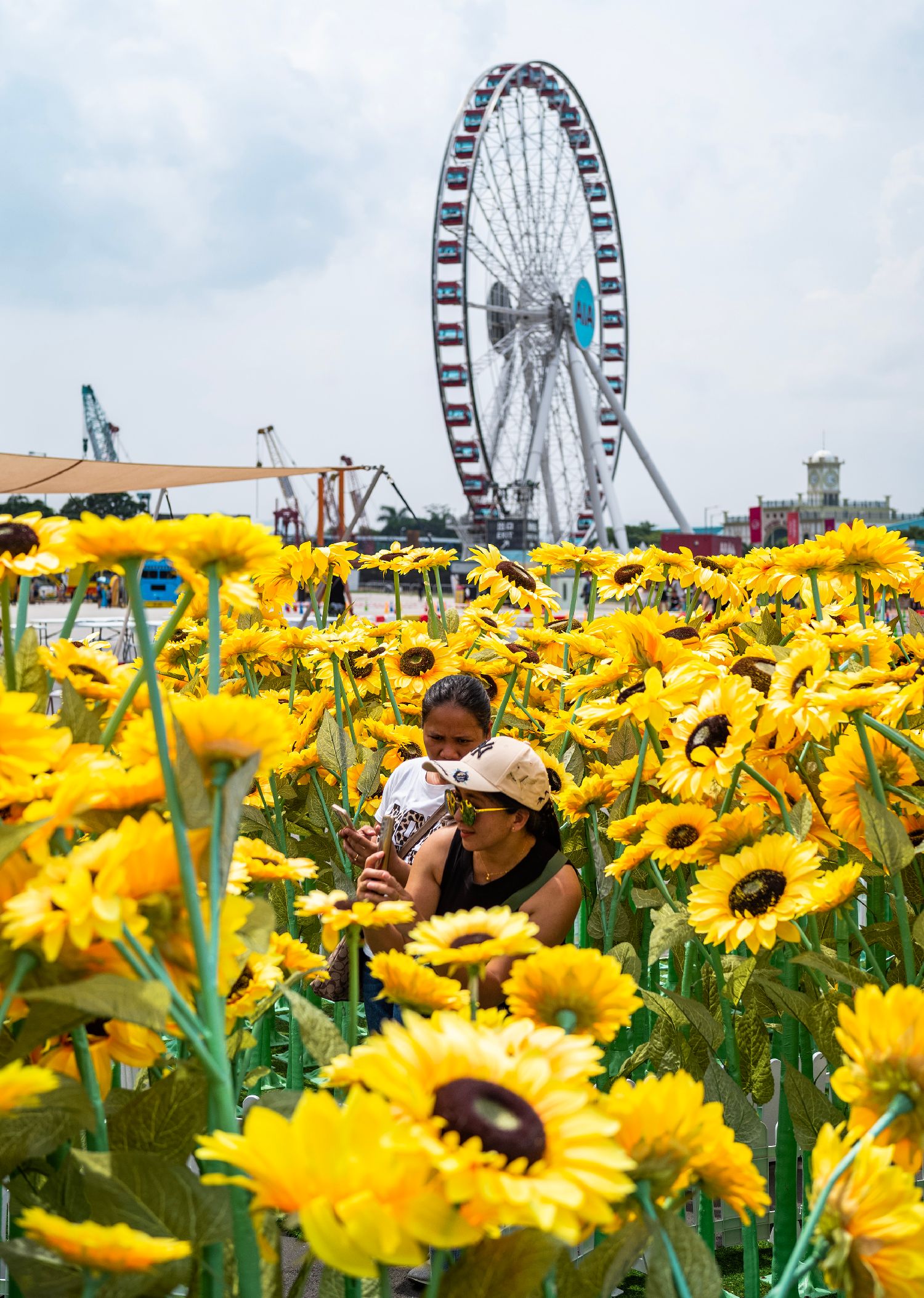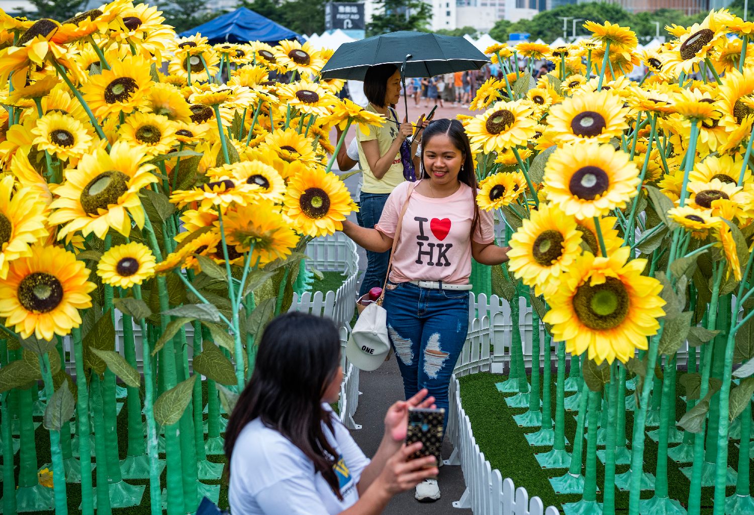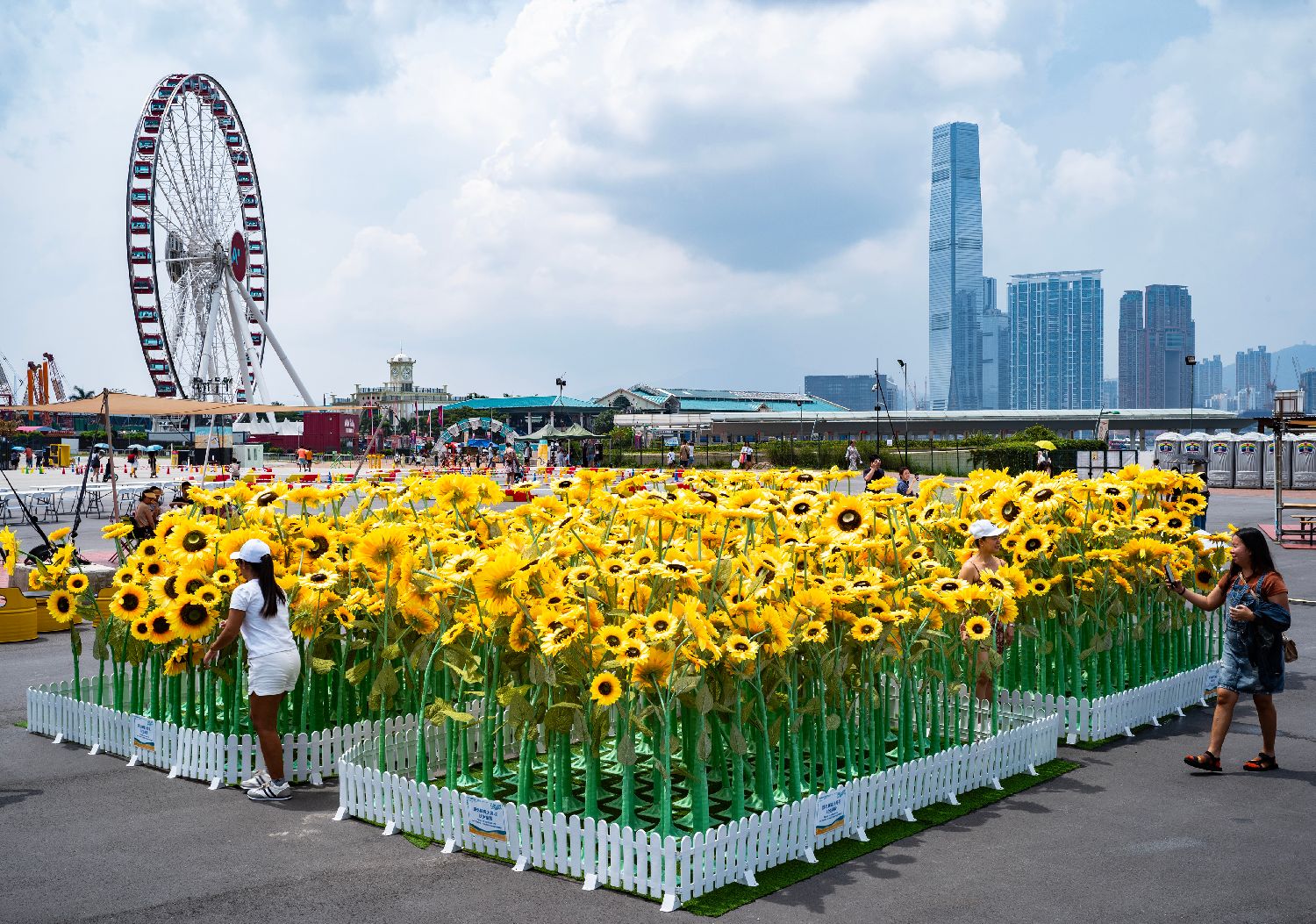 6月25日,香港中环海滨活动空间的市集上的“向日葵花海”布景为民众周末休闲增添夏日气息。
