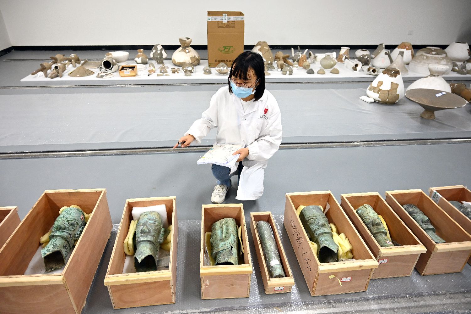 三星堆博物馆新馆展出1500余件(套)文物,其中包括300余件三星堆遗址3号至8号“祭祀坑”新出土的文物。为保证文物“迁居”步步精心,博物馆提前策划,以文物保护手段“护航”重器。图为6月24日,文保工作者正在清点文物。(中新社)