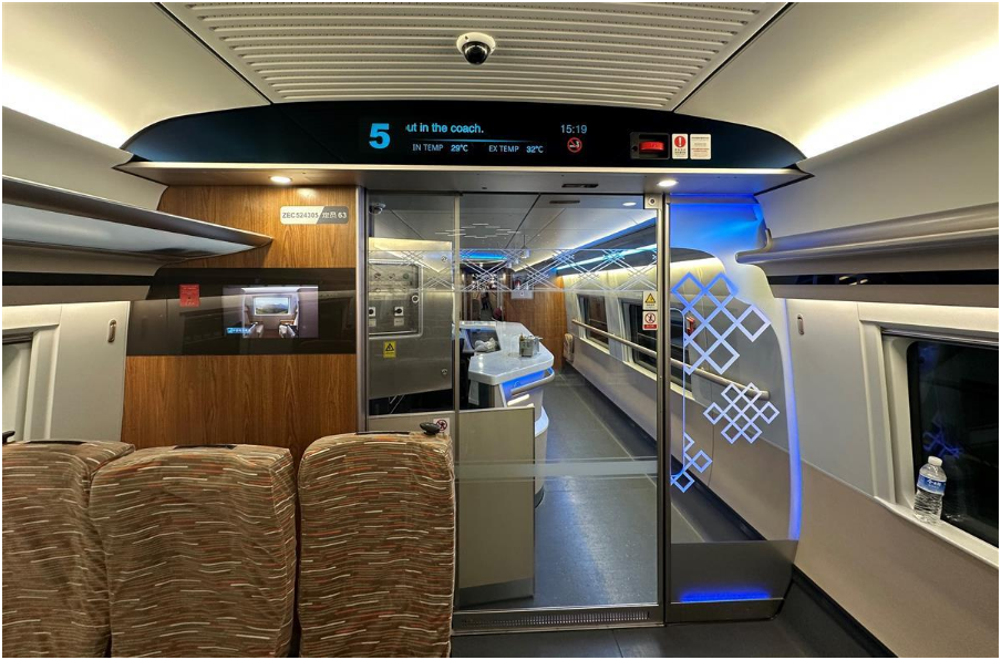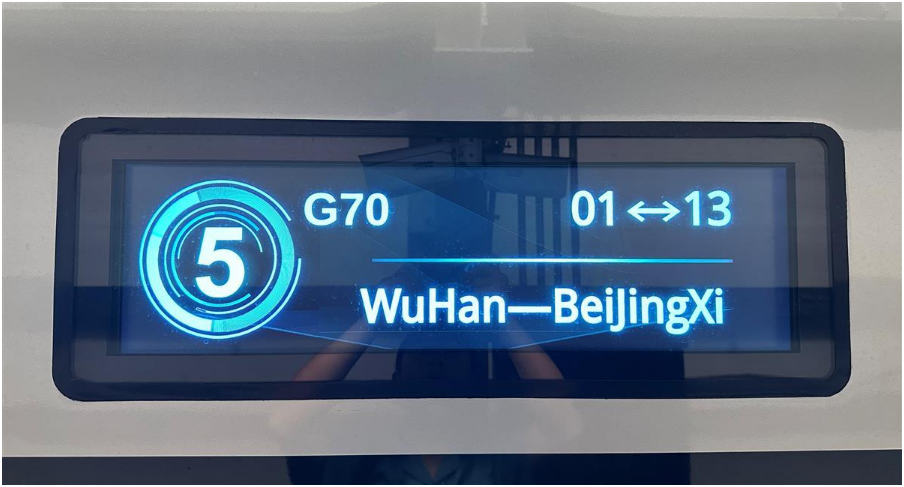 车门旁的小屏幕用来显示车厢号、车次、行驶区间等信息,便于旅客登车前查看。此前型号的复兴号列车采用的是LED屏,显示效果为黄色字体的静态显示。而这款复兴号新车型采用的则是LCD屏,不但屏幕面积变大了,清晰度也更高,还有动态效果,看上去科技感十足。