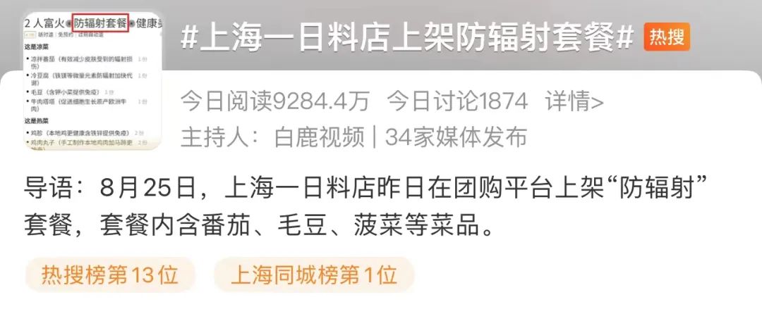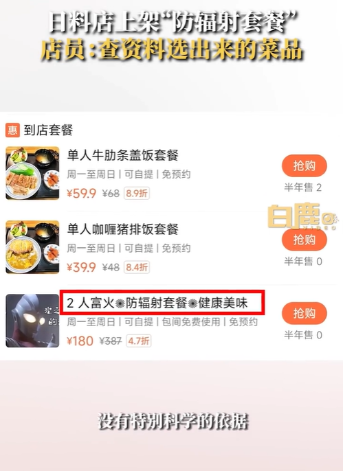 有网民发现上海一日料店8月24日在团购平台上架“防辐射”套餐。内含番茄、毛豆、菠菜等菜品。店家还给每一道菜做了“人设”,如“减小皮肤损伤”、“加快代谢”、“提供免疫”“促进细胞生长”等……