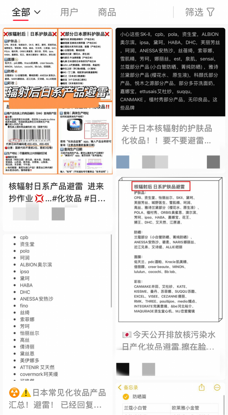 社交媒体上已出现大量“日本核辐射化妆品避雷清单”相关话题。(图/网络截图)