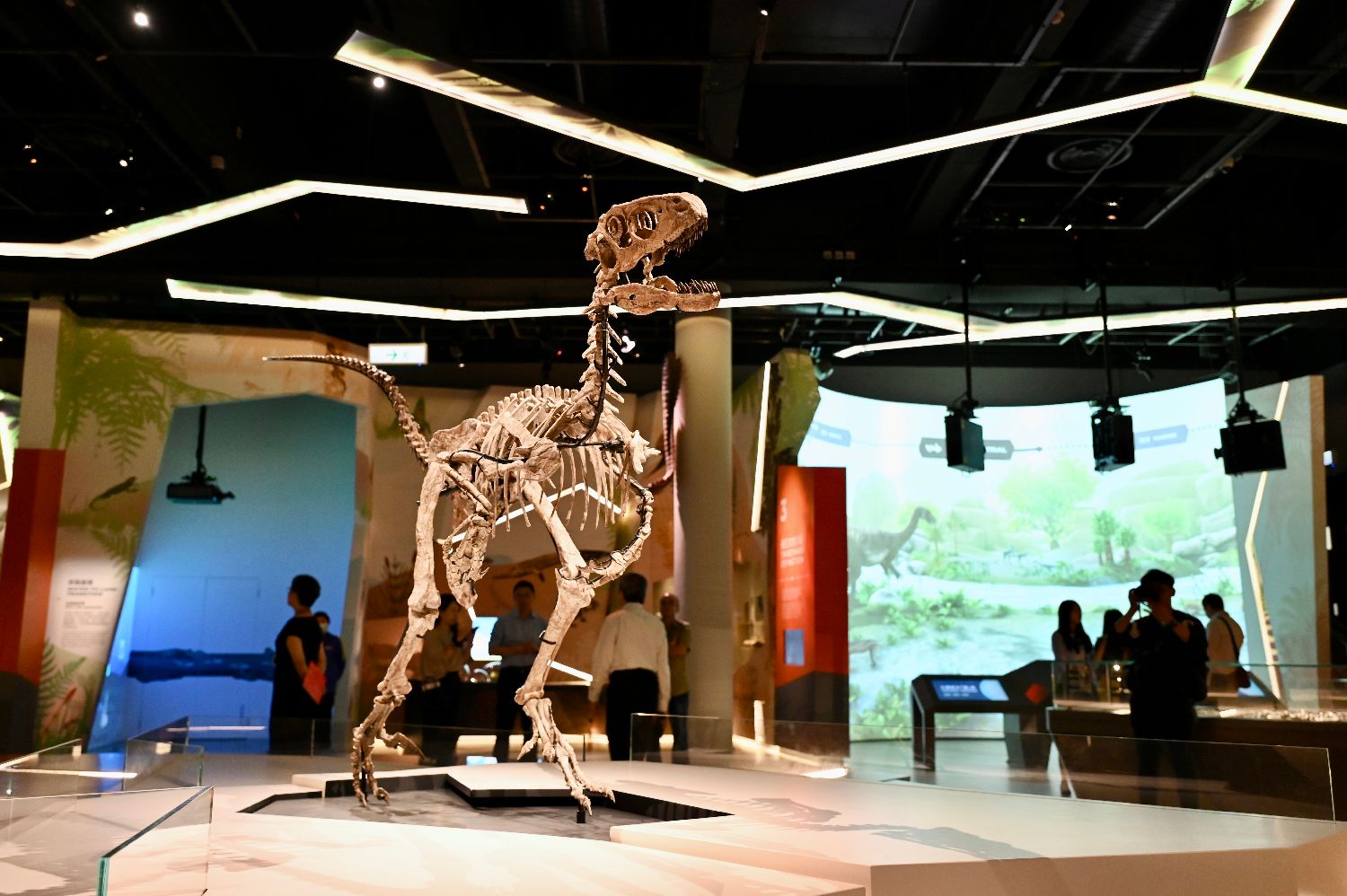 9月14日,香港科学馆举办“灭绝·新生”展览的新闻界预展,展览介绍了6.35亿年前埃迪卡拉纪以来地球生命的演化。图为展出的侏罗纪——白垩纪时期完整恐爪龙化石。(中新社)