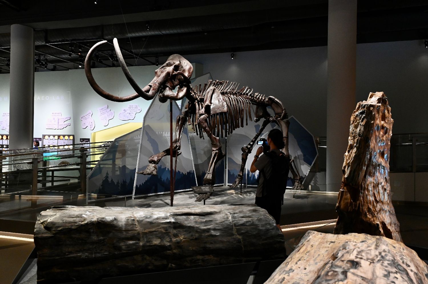 展品包括超过100组各个时期的珍贵动植物化石,如真猛犸象、近鸟龙和叠层石等;也有栩栩如生的机械恐龙和各种有趣的互动展品,并介绍挖掘化石、史前的环境和物种的演化等知识。图为展出的更新世——全新世时期的真猛犸象。 (中新社)