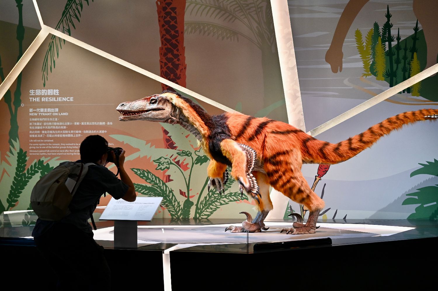 白垩纪晚期的伶盗龙互动展品,恐龙身上的毛发都得到了精细的还原。(中新社)