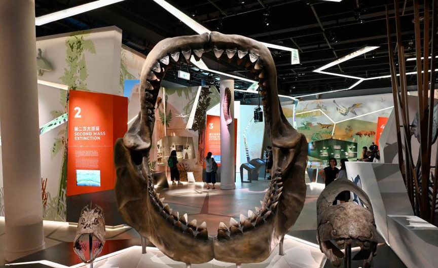 巨齿鲨化石等,展示志留纪——泥盆纪时期的鱼类演化。(中新社)