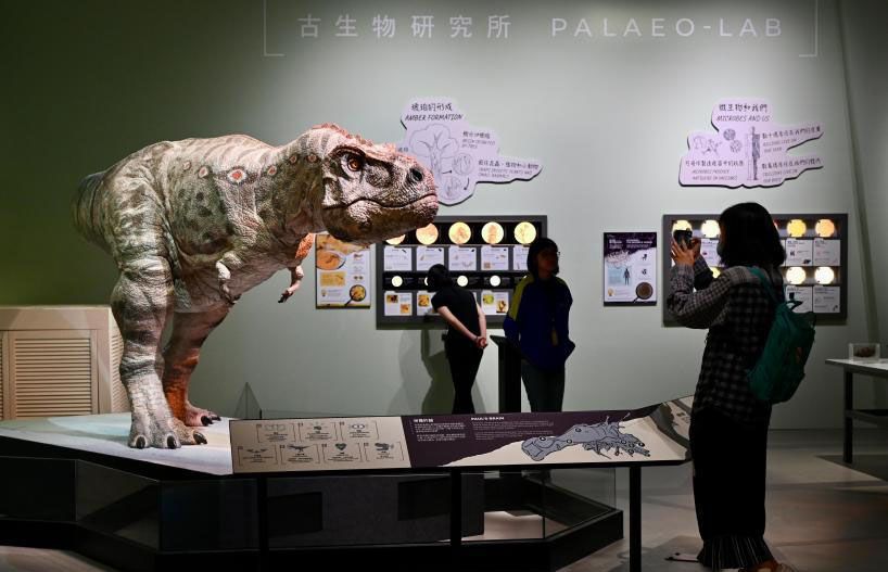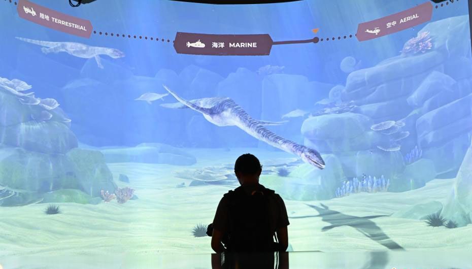 参观者观看三叠纪时期的动画影片。(中新社)