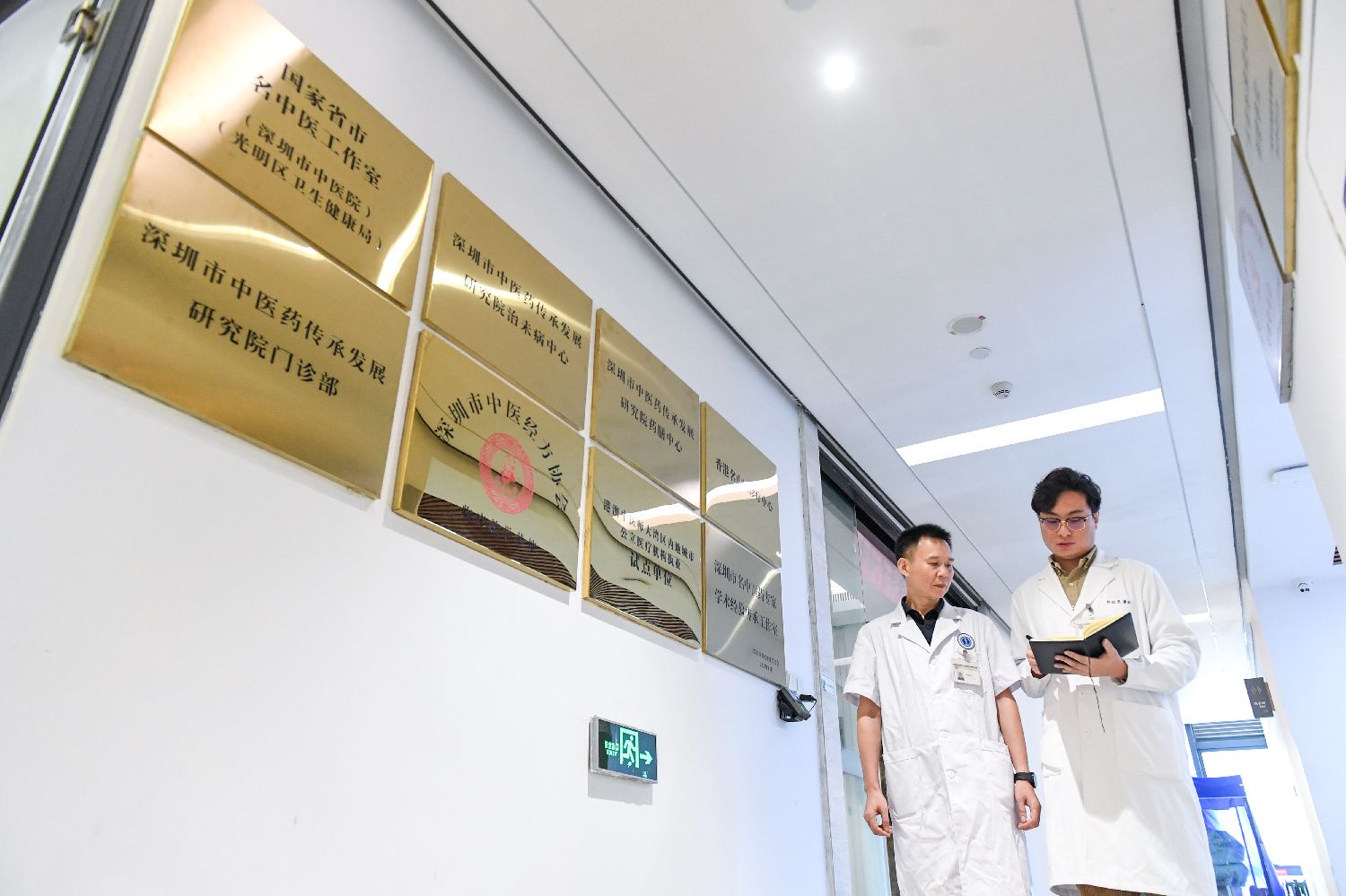 与此同时,光明区大力推进中医药事业产业融合发展,凭借深港两地工作学习的经验,郭钧泯也被委任为光明国际中医药港理事会秘书长,致力于推进内地与香港在中医药领域的交流合作。图为郭钧泯(左)在深圳市中医药传承发展研究院为病人看诊。(新华社)