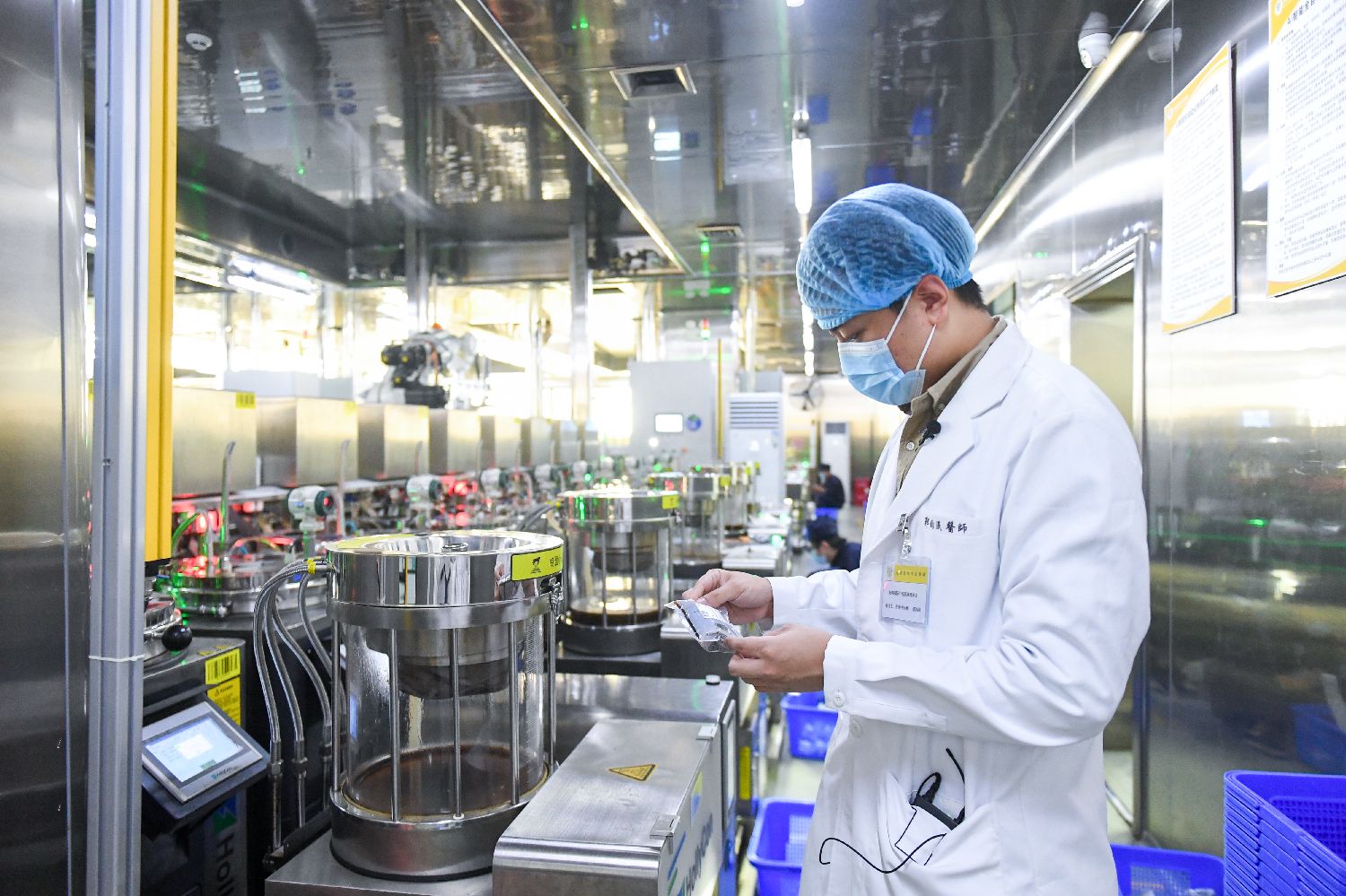 在深圳光明国际中医药港的中药饮片代煎代配中心,郭钧泯查看代煎好的中药。(新华社)