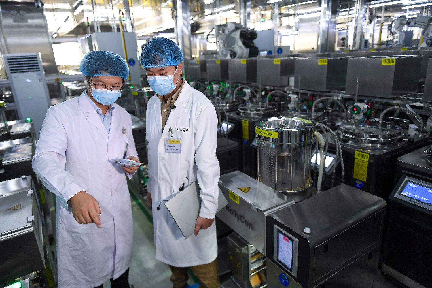 在深圳光明国际中医药港的中药饮片代煎代配中心,郭钧泯(右)和同事查看自动煎药系统运行情况。(新华社)