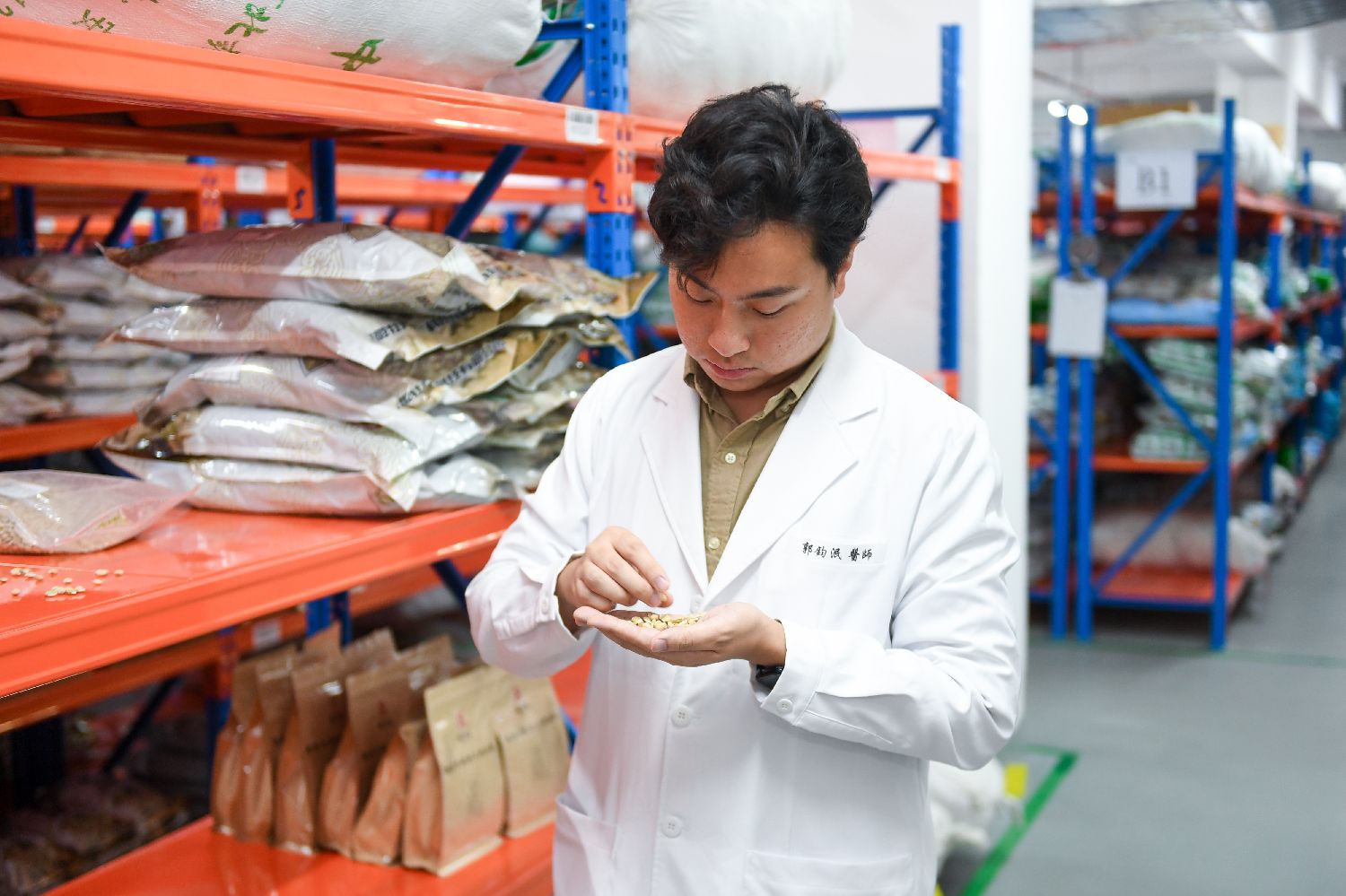 “我很热爱中医药事业,从香港老一辈创业者努力拼搏、奋发向上的‘狮子山精神’,到深圳敢闯敢试、敢为人先的精神,在这样的人文环境熏陶下,我将继续先行先试,为大湾区中医药人才交流融合作出贡献。”郭钧泯说。图为郭钧泯在深圳光明国际中医药港的药材储备基地查看药品情况。(新华社)