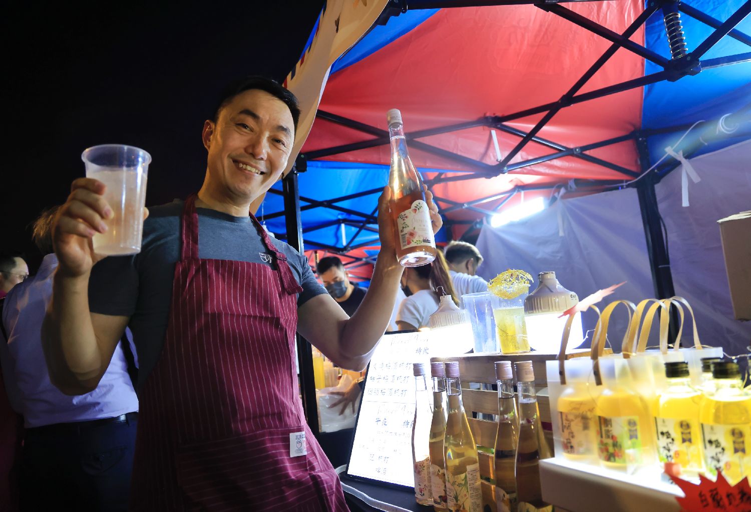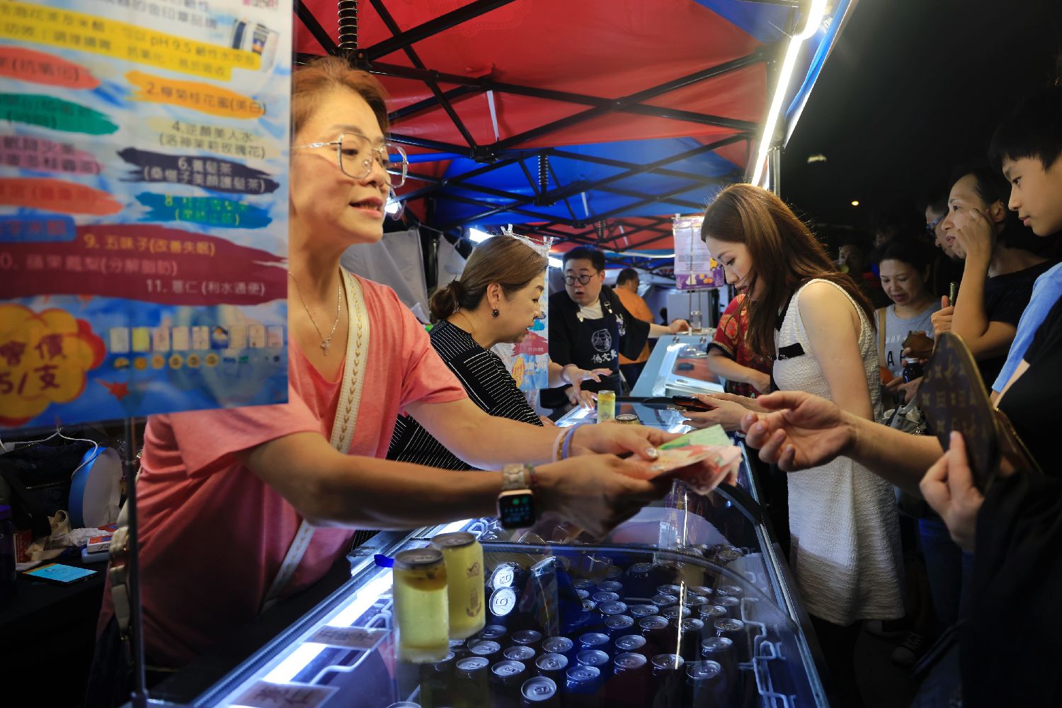 首个怀旧香港夜市“海滨艺游坊”9月27日至10月2日开市,在湾仔海滨为市民及旅客免费提供集香港文化、艺术、音乐及科技的嘉年华,让民众亲身感受香港百年的老经典情怀。图为饮品摊主为顾客找零。(香港中通社)