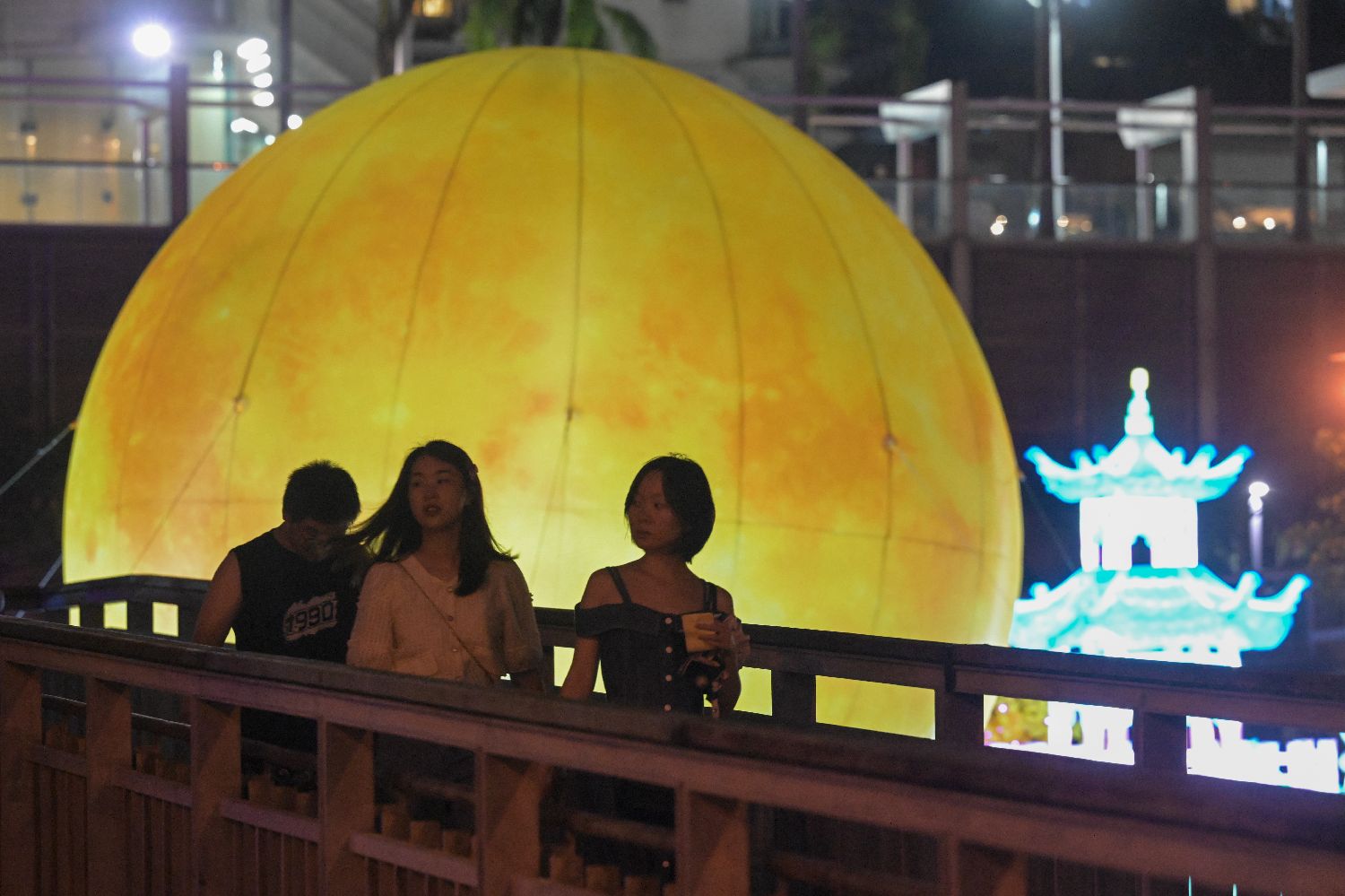 香港市民在西湾河爱秩序湾公园观赏《千里共婵娟》灯饰。(中新社)