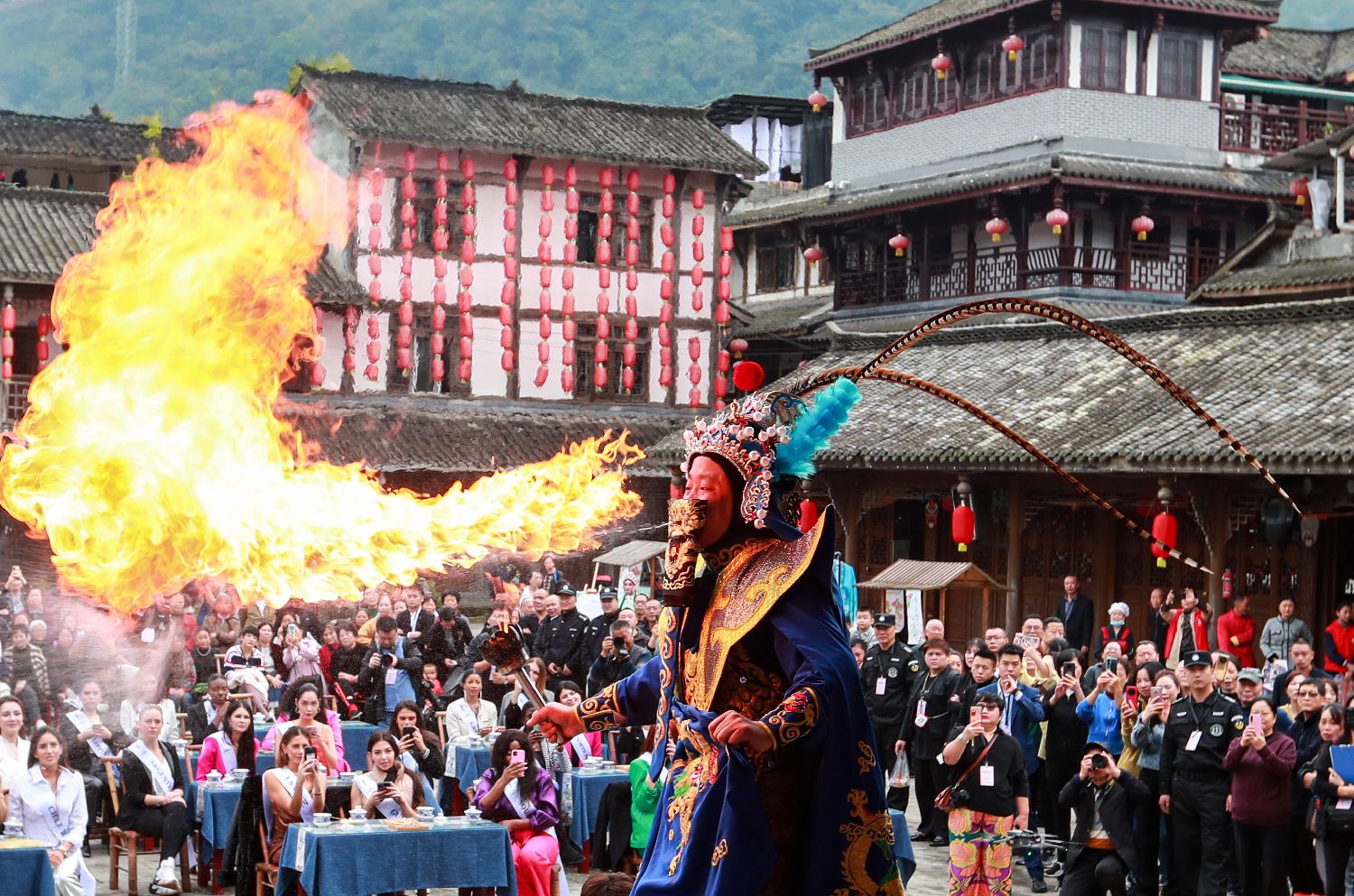 10月25日,在四川省成都市彭州市海窝子古镇,选手们观看川剧吐火表演。(中新网)