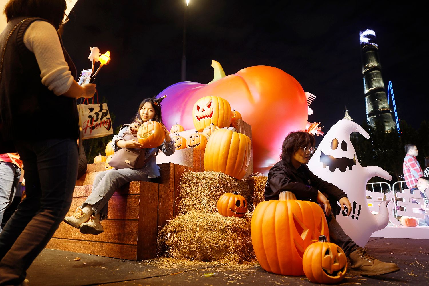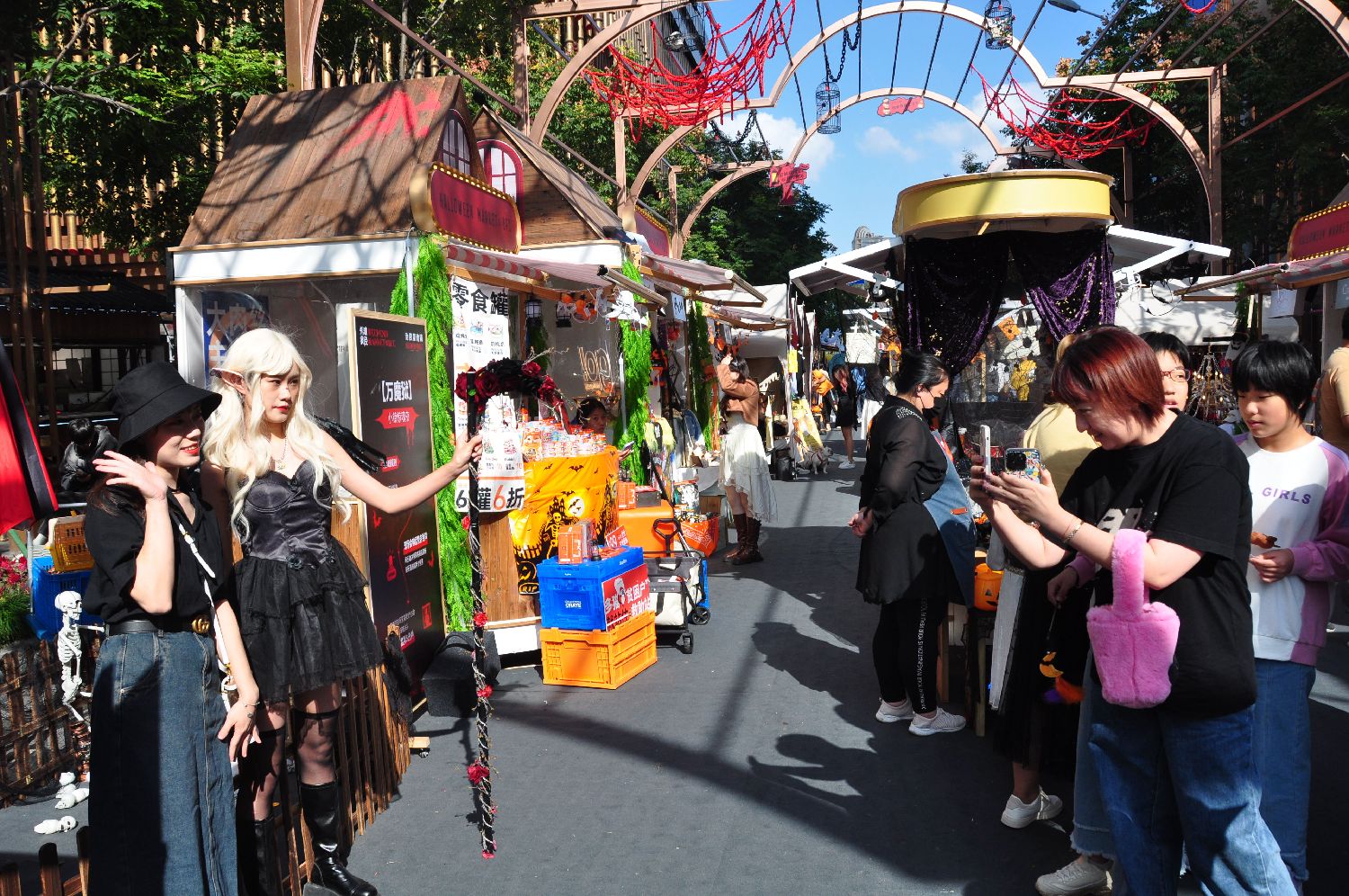 10月28日,上海民众身着各式“万圣节”装扮,参加BFC枫径-勃艮第诡镇万圣限定市集,欢乐度周末。(中新社)