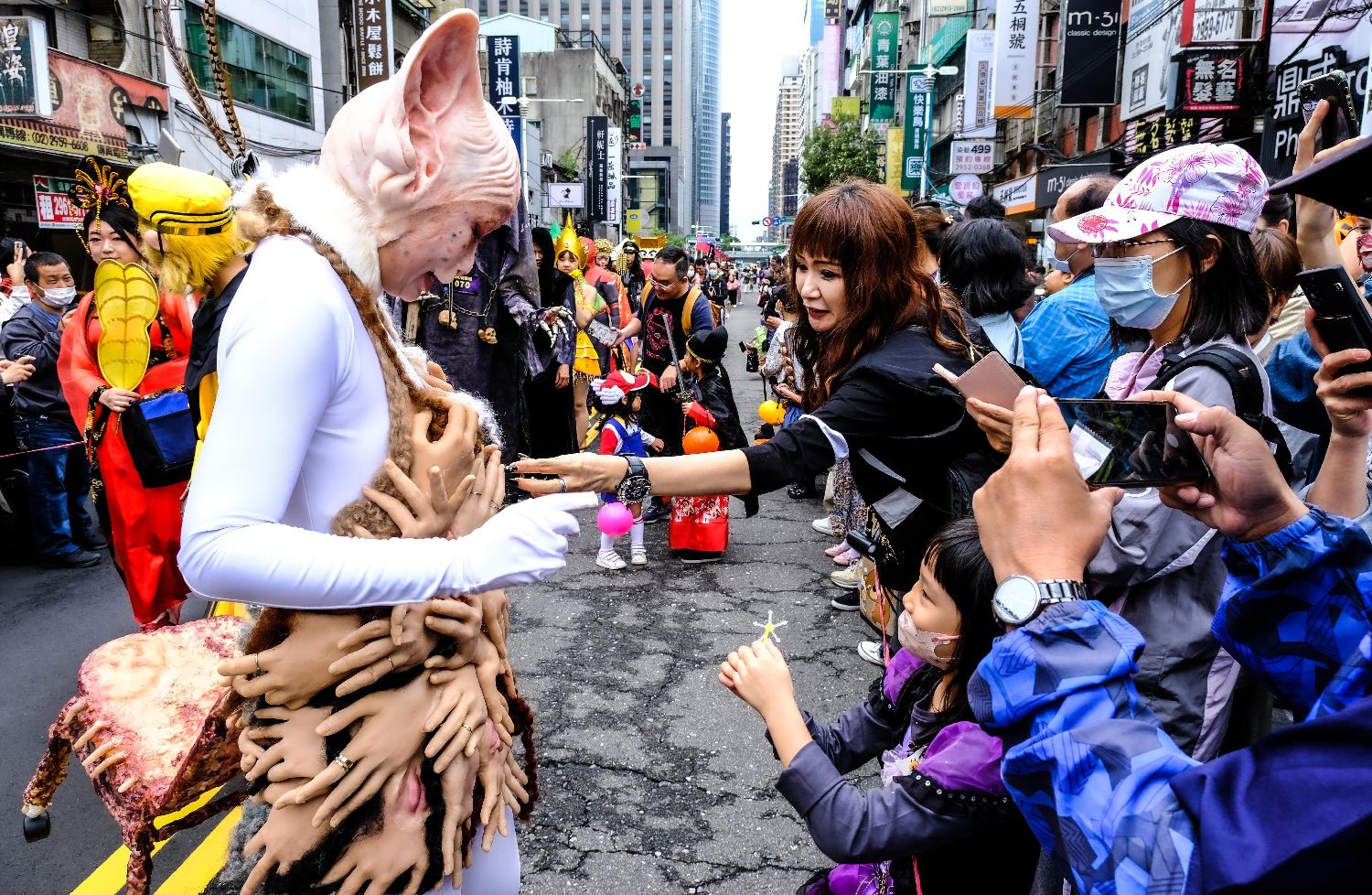 台湾新北市“2023府中搞什么鬼”万圣节活动于10月28日在板桥府中商圈举行,今年增加了变装踩街游行,不给糖就捣蛋等趣味活动。图为参会民众与演员互动。(中新社)