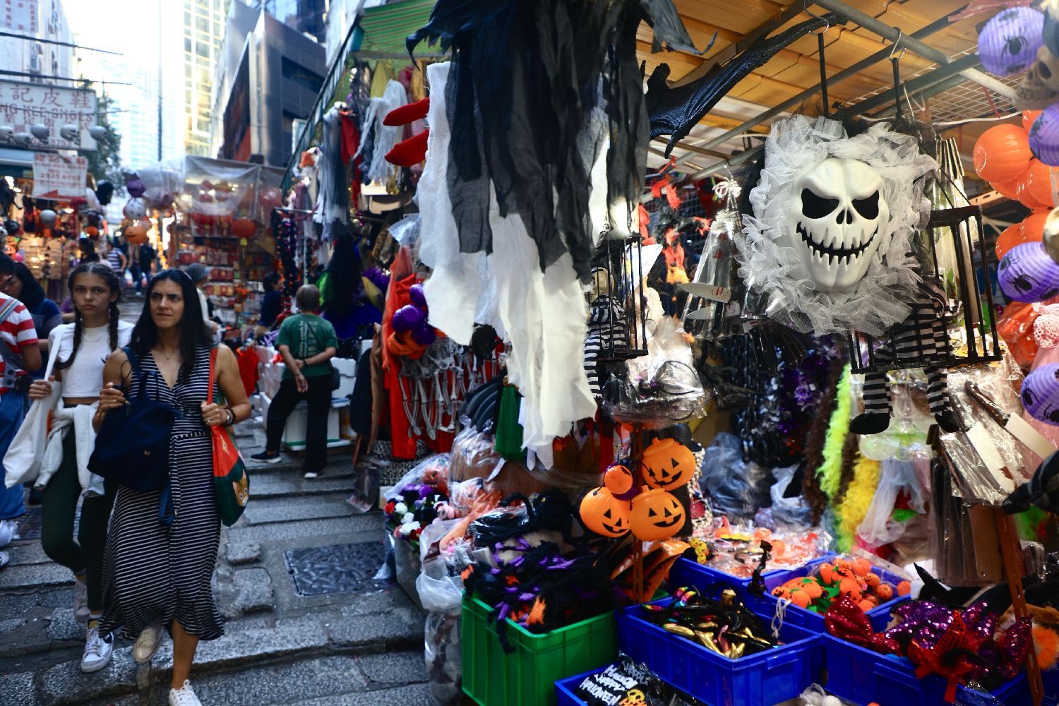 10月24日,香港中环石板街的店铺挂满了琳瑯满目的万圣节商品,吸引了大批游人前来观光、消费。(中新社)