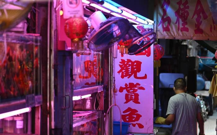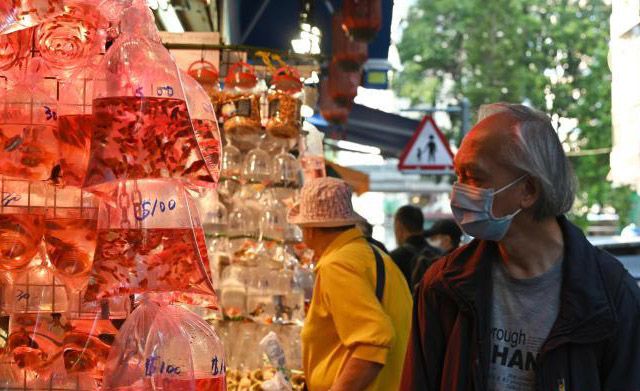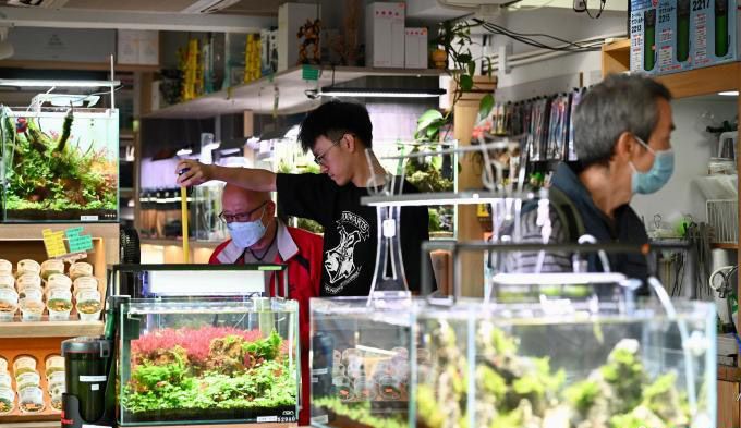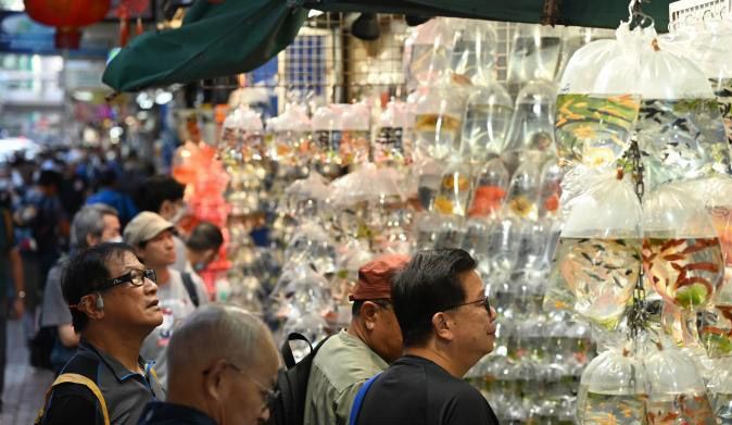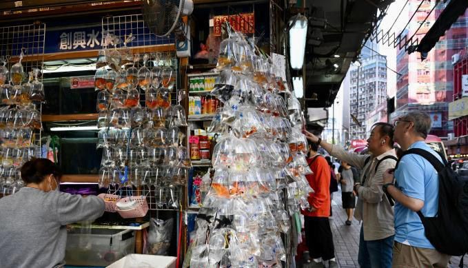 旺角是香港繁华的社区之一,在旺角闹市中有一条特色“金鱼街”,被誉为闹市中的“水族馆”,是游客喜欢到访的地方。图为“金鱼街”商户售卖不同种类的观赏鱼。(中新网)