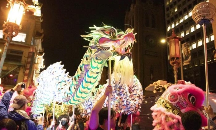 当地时间11月10日,美国旧金山唐人街夜市上的舞龙舞狮表演吸引游客。(图/中新网)