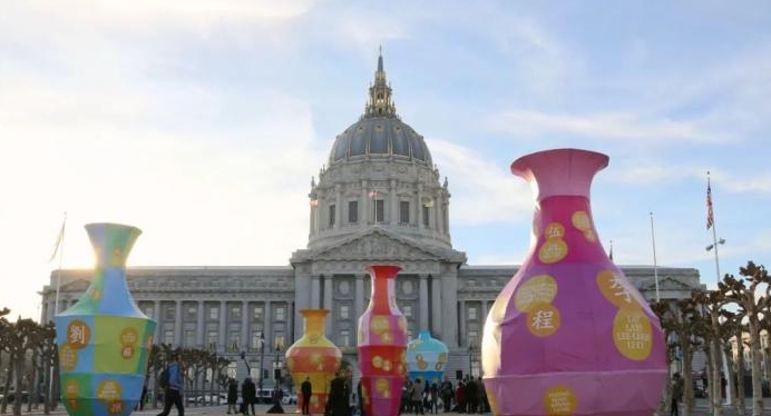 资料图:2017年1月,美国旧金山市政府广场,以华人姓氏为主题的装置艺术作品“岁岁平安”揭幕,庆祝中国农历新年。(图/中新网)