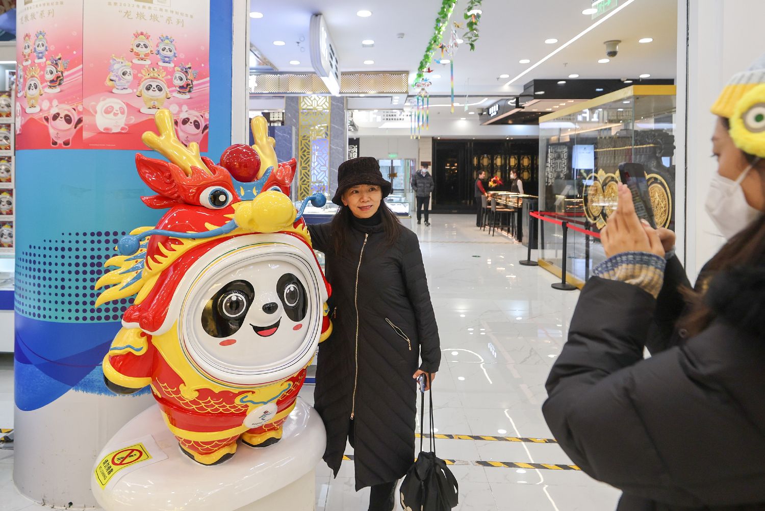 12月7日,市民在北京王府井工美大厦与“龙墩墩”拍照。(中新社)