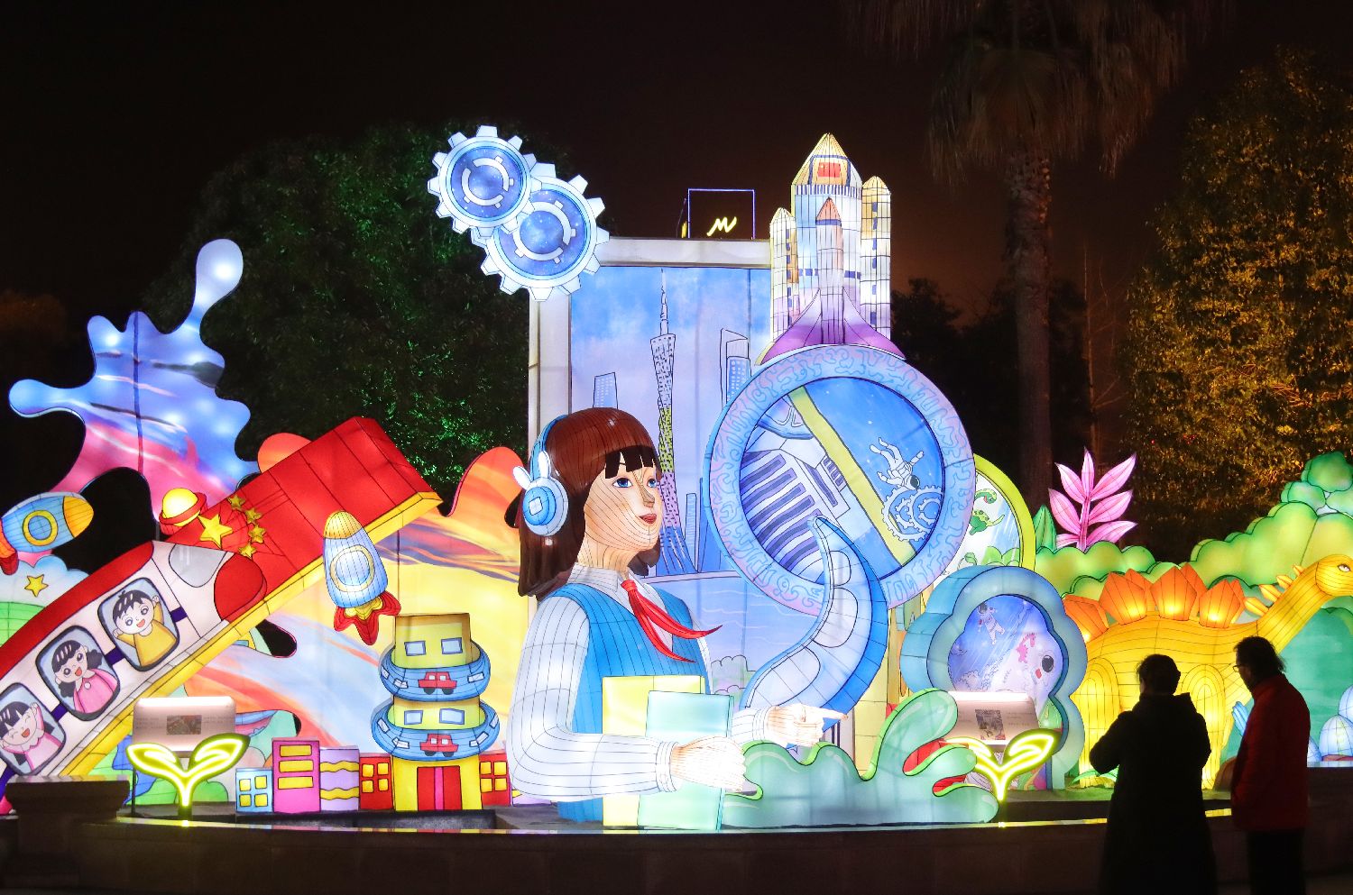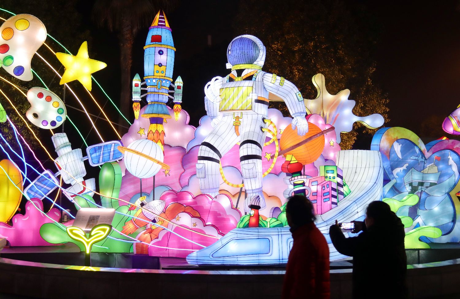 1月3日,江苏常州,游客在“2024常州灯会”观赏以“童真里的色彩”为主题的童画花灯。据悉,这批“童画花灯”的图案源于35幅儿童画作品,展现了童趣。图为科教主题“童画花灯”。(中新社)