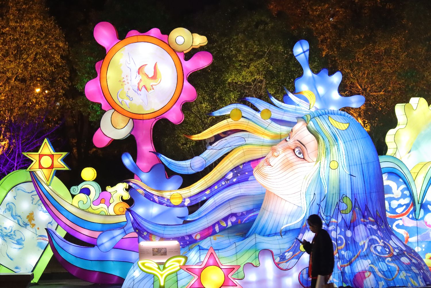 1月3日,江苏常州,游客在“2024常州灯会”观赏以“童真里的色彩”为主题的童画花灯。据悉,这批“童画花灯”的图案源于35幅儿童画作品,展现了童趣。