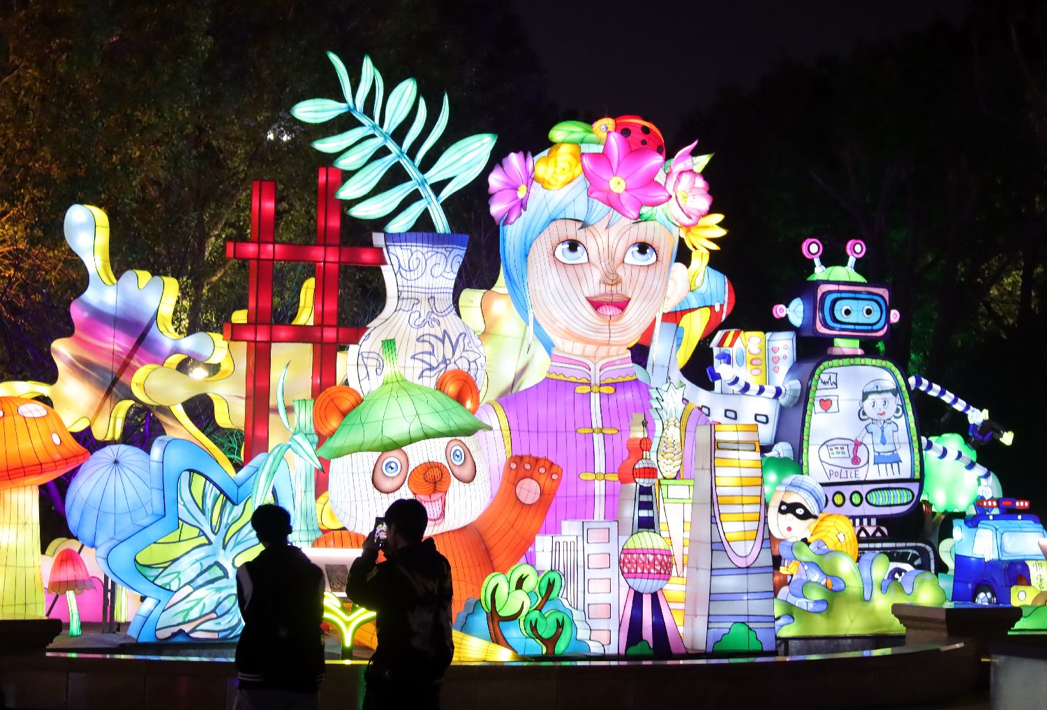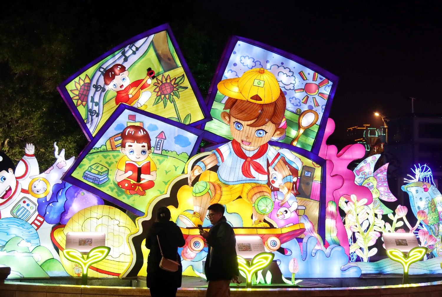 游客在灯会现场观赏“童画花灯”。(中新社)