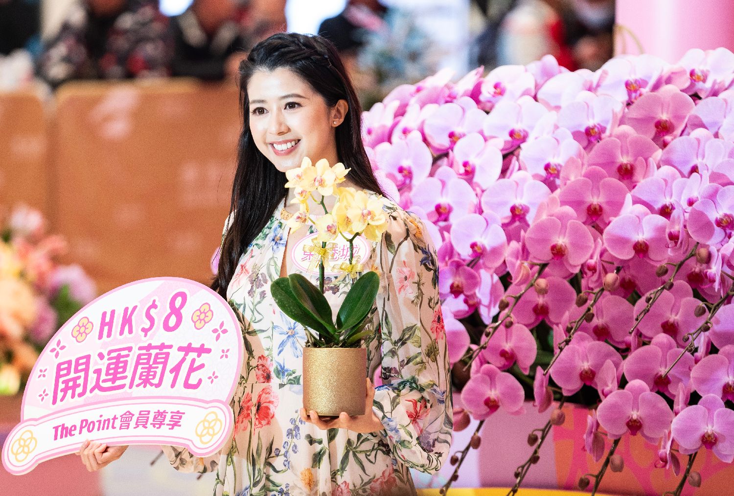 1月23日,香港将军澳一家商场举办第十八届新春花展会,用全新色系和香味的十八款新品兰花、其他逾百款兰花和各式鲜花营造“繁花锦簇御庭园”,既方便市民现场选购,也为即将到来的中国农历龙年增添喜庆。图为一名模特展示“开运兰花”。 (中新社)