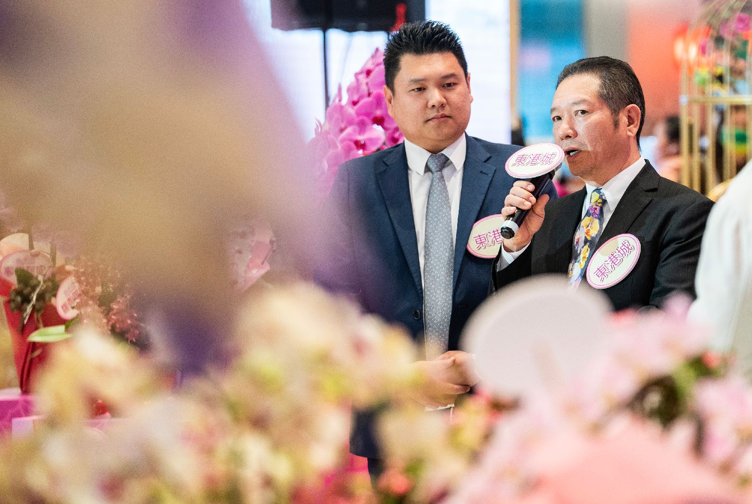香港兰花大王杨小龙(右)和其子杨尹俊在现场介绍展出的兰花新品。(中新社)