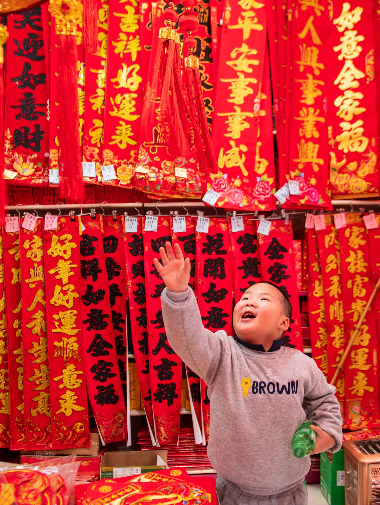 【贴窗花、对联】在中国传统民俗之中,剪窗花贴对联,一直以来都是春节和小年必做的事情。窗花、对联大多数都是以十二生肖图案,或者是吉祥如意的字样来创作,因为这些图案汉字预示着新的一年“吉祥如意”。图为2月1日,一名儿童在贵州省从江县一家节庆用品店挑选春节饰品。(新华社)
