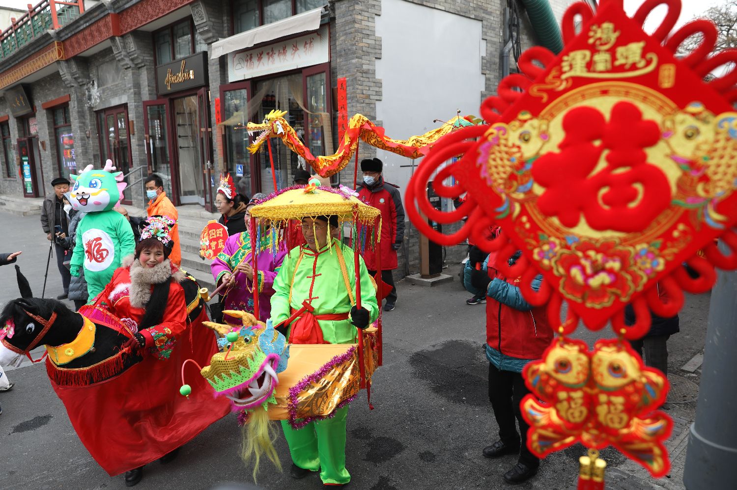 【婚嫁】中国民间认为过了小年之后,在地上值班的神仙们都上天述职了,地上也就“百无禁忌”,娶媳妇、嫁闺女也就不用再择日子,这种现象也被叫作是“赶乱婚”。图为2月1日,北京东四街道“旭日东升照瑞彩 龙腾四海庆吉祥”小年庙会上的“跑驴”表演,“跑驴”一般都是表现一对农村新婚夫妻在回娘家的路上发生的过沟、爬坡、驴惊、抢救等一系列经过,通过说唱跳舞诙谐风趣地表演出来。(中新社)