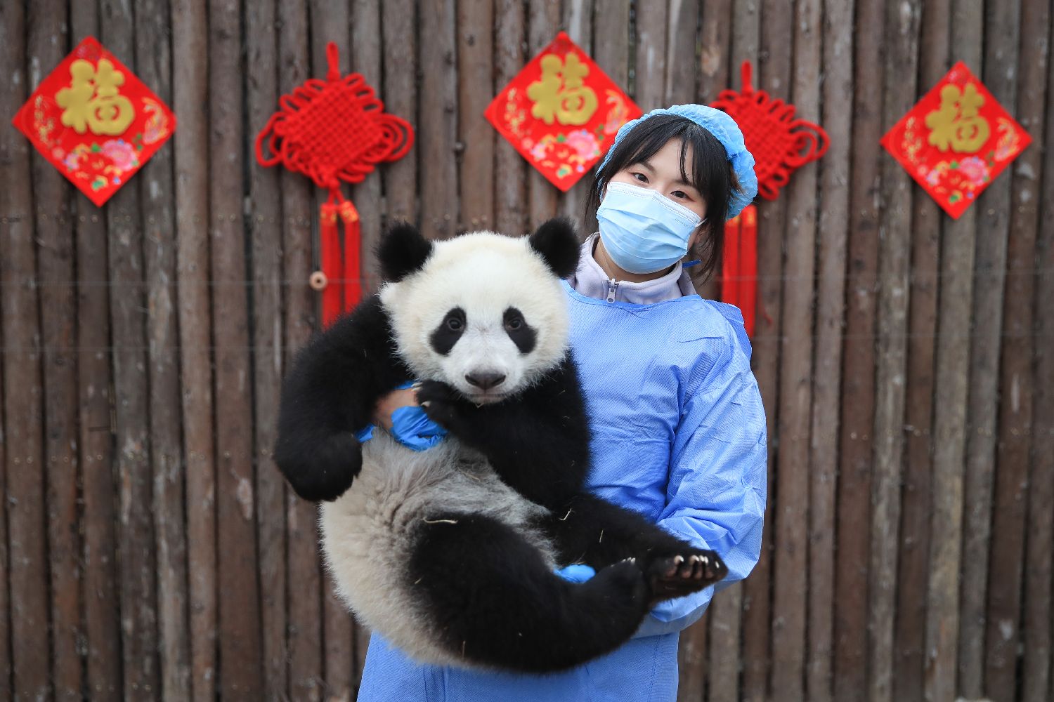 两家机构2023年共成功繁育大熊猫34只,半岁左右的大熊猫宝宝成长状态良好,萌态十足。图为成都大熊猫繁育研究基地星星产房,工作人员抱着大熊猫宝宝拍摄全家福。(新华社)