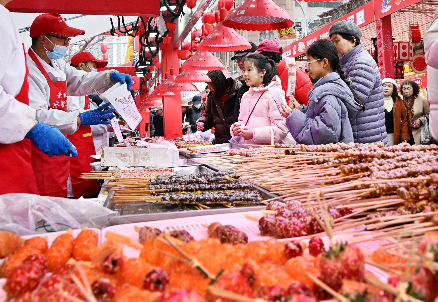 2月18日,2024年青岛萝卜·元宵·糖球会正式开幕,活动包含赏花灯、观舞龙、赶大集、游园会等特色民俗活动,吸引不少市民、游客前来参观。图为游客在萝卜·元宵·糖球会上选购糖球。(新华社)