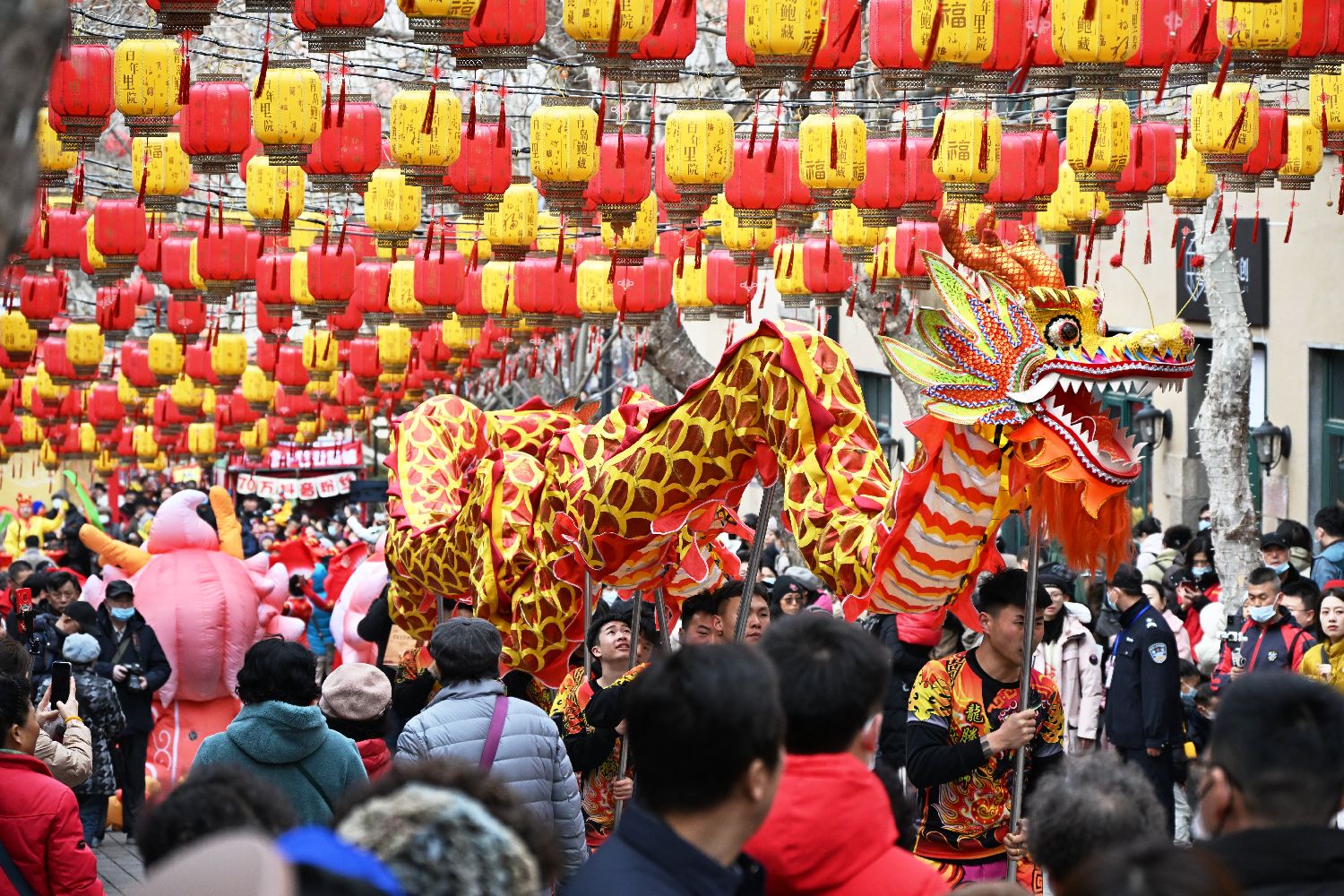 游客在萝卜·元宵·糖球会上观看舞龙表演。(新华社)