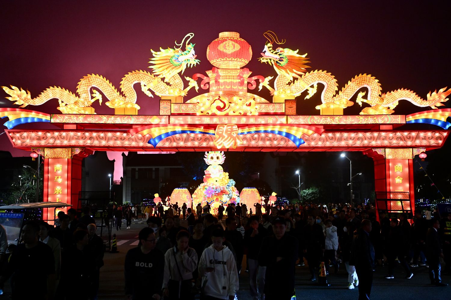 当地时间2月20日晚,第22届“两马同春闹元宵”在福州琅岐海青营地会展中心拉开帷幕。图为花灯展吸引大批市民前来观看。(图/中新社)