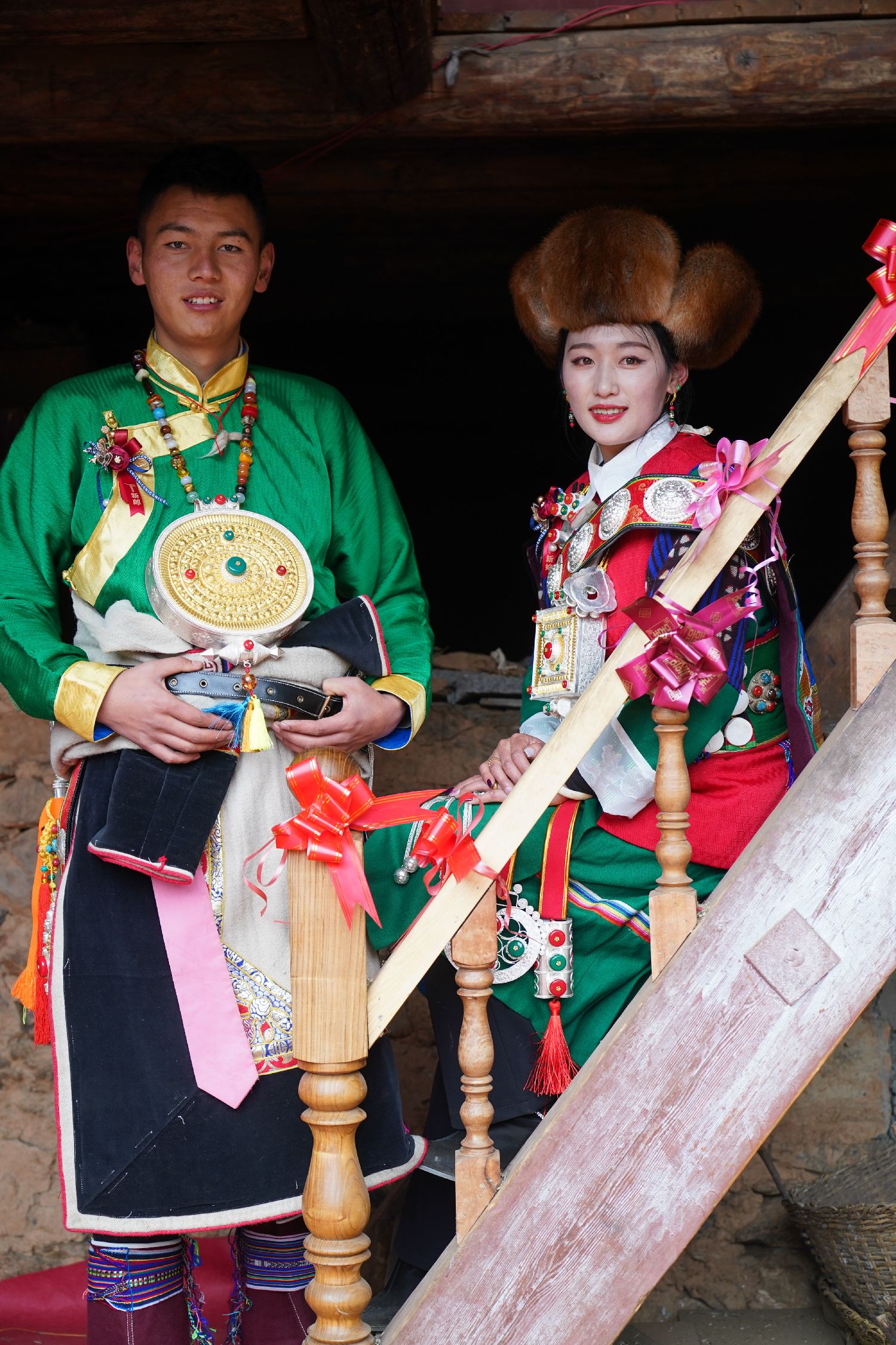 尼汝村位于云南普达措国家公园景区内,每到夏天便会成为徒步野营爱好者的天堂。未来央宗措姆想把老家改建成客栈,带领游客观赏尼汝四季美景,成为“新牧民”继续守护妈妈和外婆的牧场。图为婚礼当日,新人在老房子前拍照。(中新社)