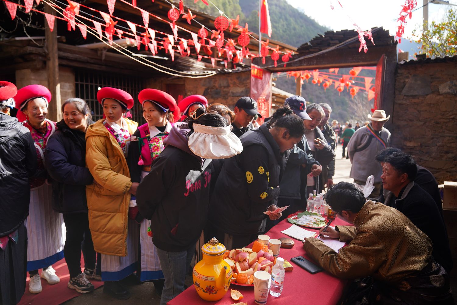 2月20日,婚礼当日,参加婚礼的亲朋好友在排队挂礼。(中新社)