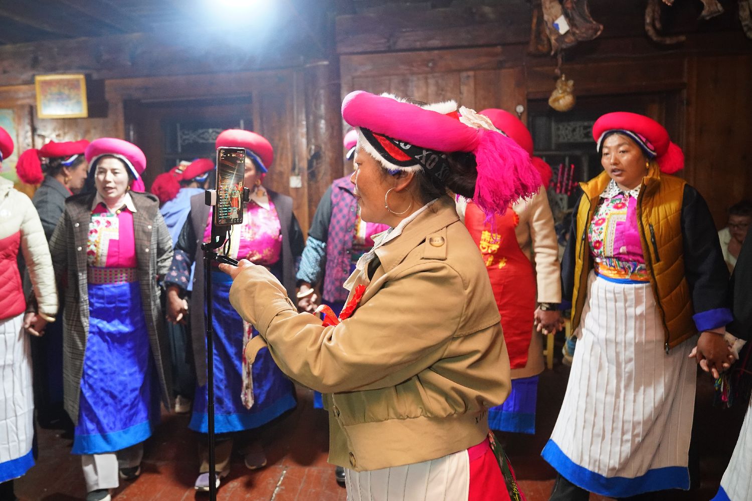 2月20日,央宗措姆的姑妈用手机直播锅庄舞,与网络上“云观礼”的朋友分享喜悦。(中新社)