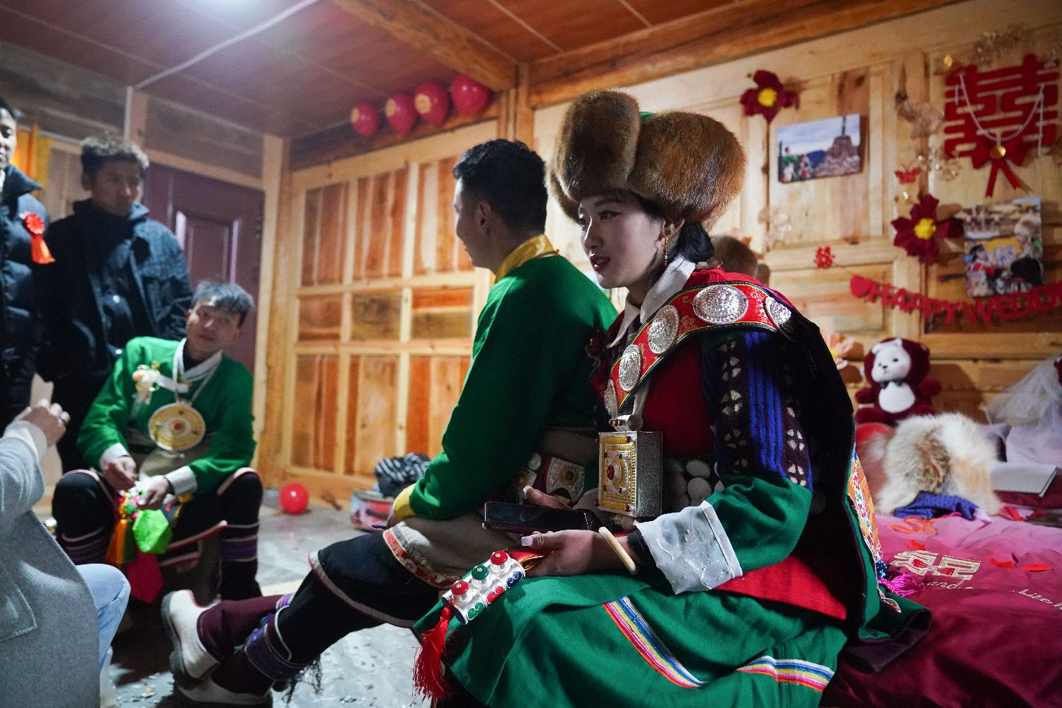春节刚过,藏族姑娘央宗措姆在老家云南省迪庆藏族自治州香格里拉市尼汝村与丈夫吹批举行了婚礼,从各地赶来的亲朋好友相聚于此,为新人送上祝福。央宗措姆一家世代居住在尼汝村,与这里的其他人家一样过着半农半牧的生活。