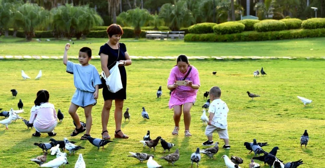 2020年8月,市民在筼筜湖边的公园里喂鸽子。(图/中新网)