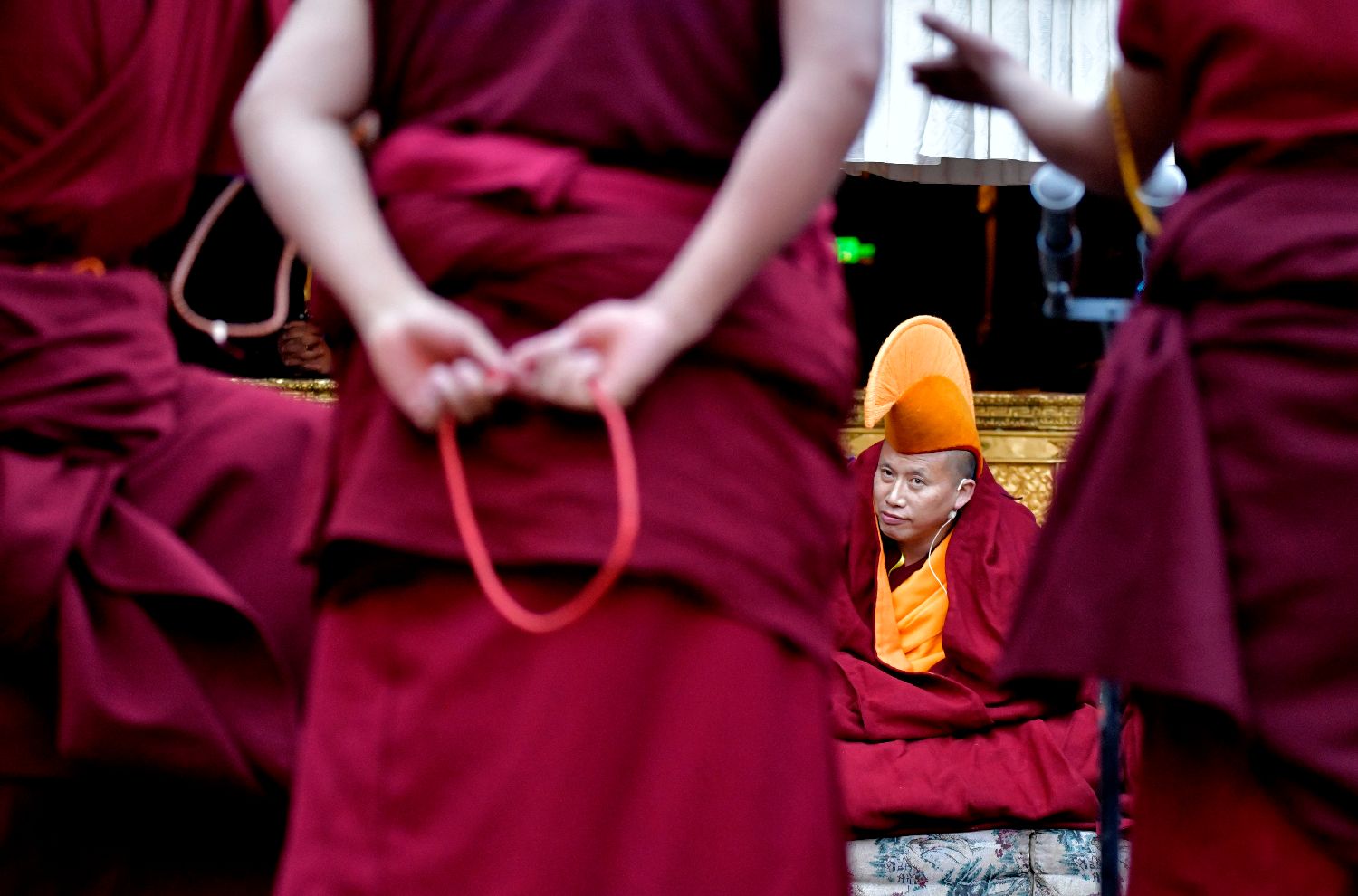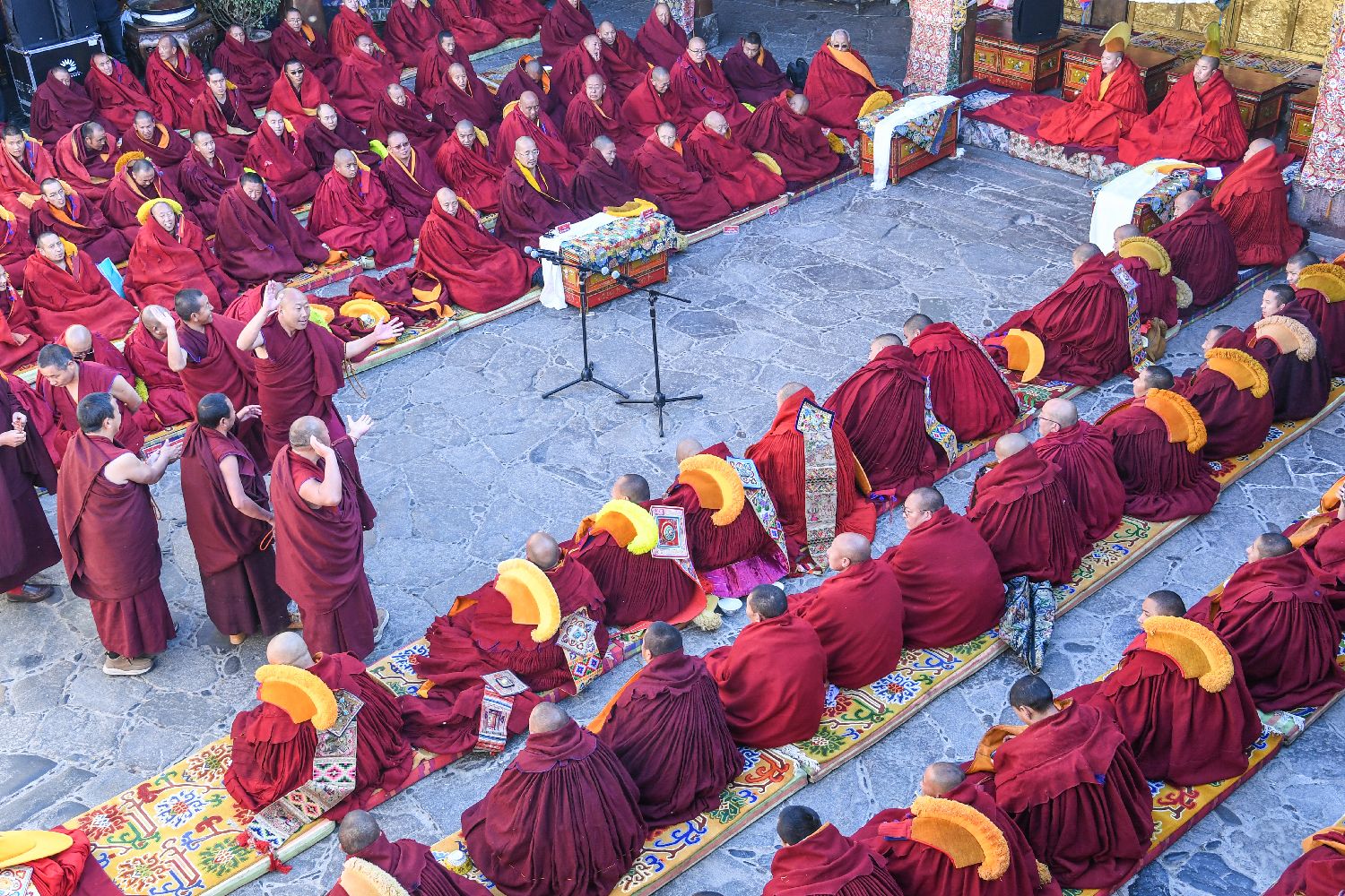 格西,藏语意为“善知识”,格西拉让巴是藏传佛教格鲁派显宗高级学衔。图为陪考僧人围绕藏传佛教五部经典向考僧提问。(中新社)